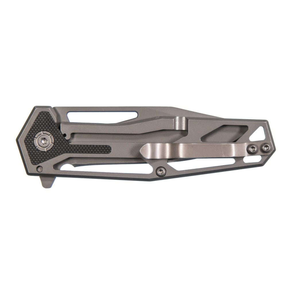 Il manico, di fattura spartana, presenta fori pronunciati che riducono ulteriormente il peso complessivo del coltello. Nonostante i fori pronunciati, i progettisti sono riusciti a posizionare un clip da tasca sul manico e a dotare il coltello di un affidabile sono riusciti a posizionare un clip da tasca sul manico e a dotare il coltello di un affidabile sistema di sicurezza FrameLock, che impedisce la chiusura accidentale del coltello e quindi eventuali lesioni. L'apertura all'estremità del manico può essere utilizzata per far passare un cordino o uno spago.