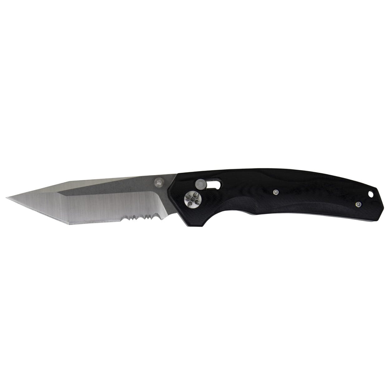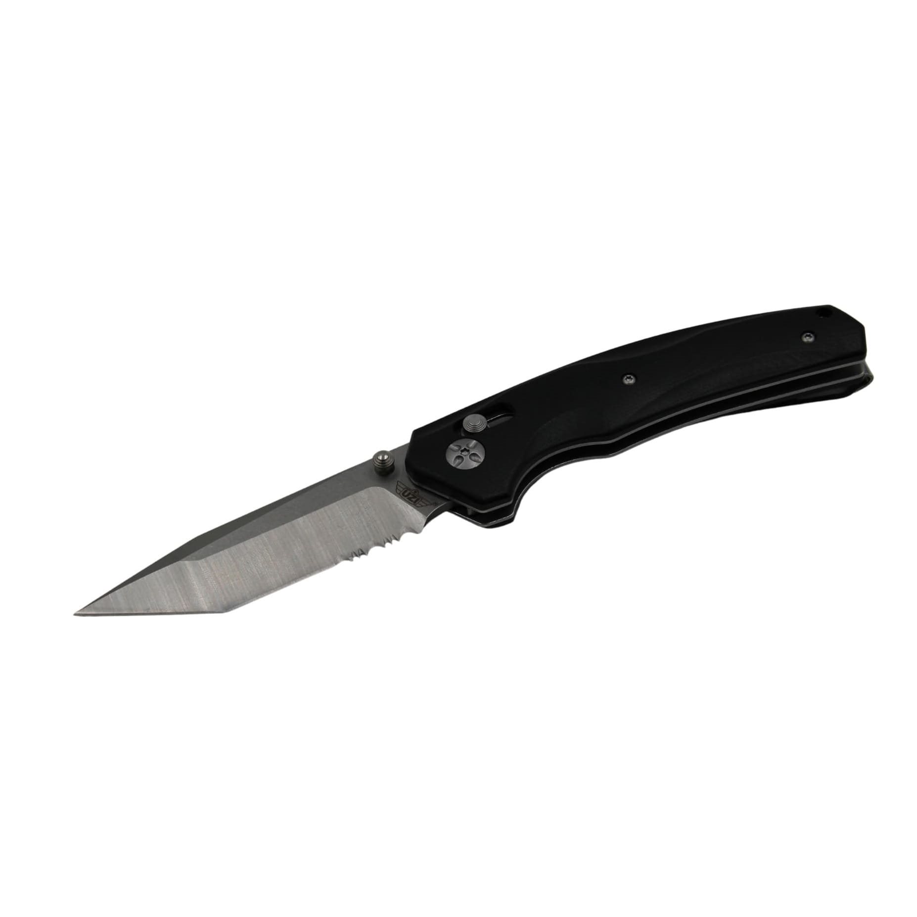Coltello tattico con lama combinata. La lama a forma di tanto è realizzata in acciaio inossidabile 8Cr18 ed è dotata di un perno su entrambi i lati per facilitarne l'apertura. Una volta aperta, la lama è bloccata da un fermo Axis lock, il cui comando si trova nella parte anteriore dell'impugnatura. L'impugnatura è piacevolmente sagomata per una presa salda e i suoi rinforzi sono realizzati in materiale G10. Questo materiale è caratterizzato da una resistenza eccezionale e offre un'ottima aderenza anche in condizioni estremamente difficili, sott'acqua, ecc. Infine, il G10 è un perfetto isolante elettrico e un eccellente isolante termico sia al caldo che al freddo. All'estremità del manico è presente un pratico foro per il passaggio del cordino di sicurezza. Naturalmente è presente anche una clip metallica da tasca.