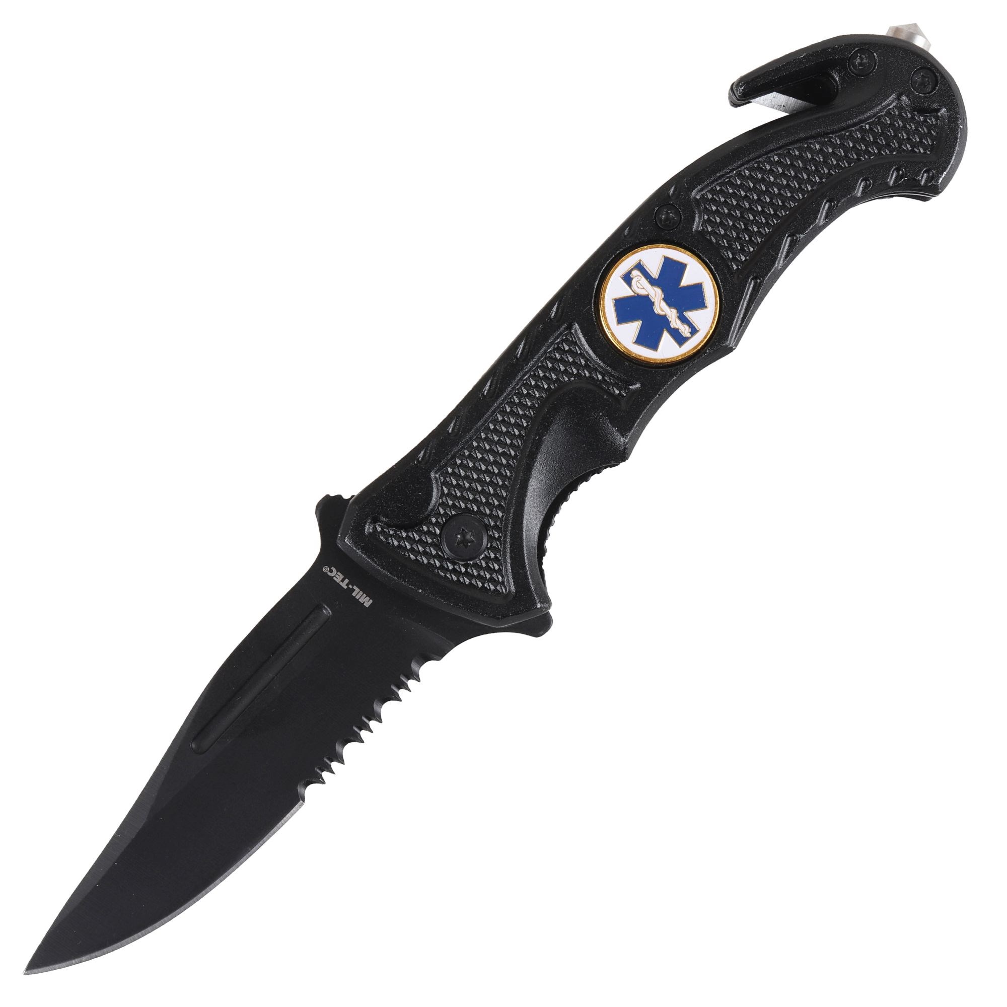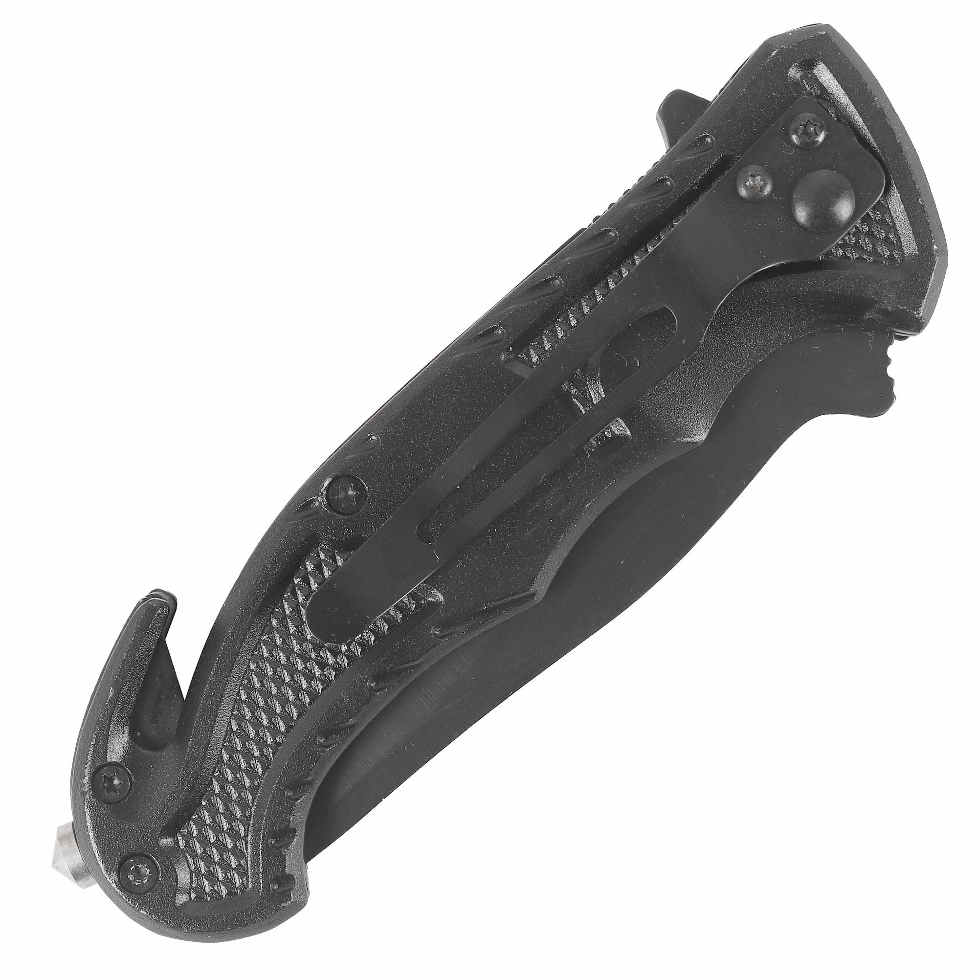 Coltello tascabile pieghevole con taglierina per cinghie. Lama a metà in selce fissata con una vite che può essere serrata in qualsiasi momento. Dotato di clip da cintura. Ulteriori informazioni