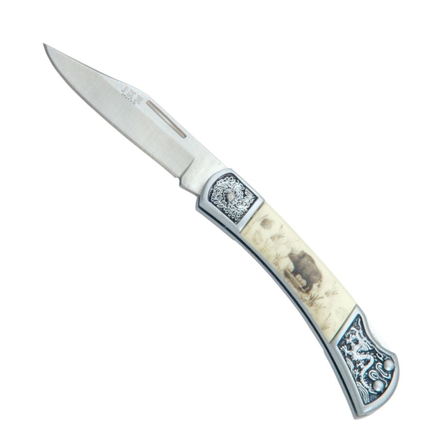 Coltello da caccia pieghevole con decorazioni metalliche sui lati del manico e motivo caccia. Lunghezza totale: 15 cm. Lunghezza lama: 6,5 cm. Ulteriori informazioni