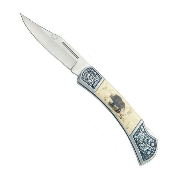 Coltello da caccia pieghevole con decorazioni metalliche sui lati del manico e motivo caccia. Lunghezza totale: 19 cm. Lunghezza lama: 8,5 cm. Ulteriori informazioni