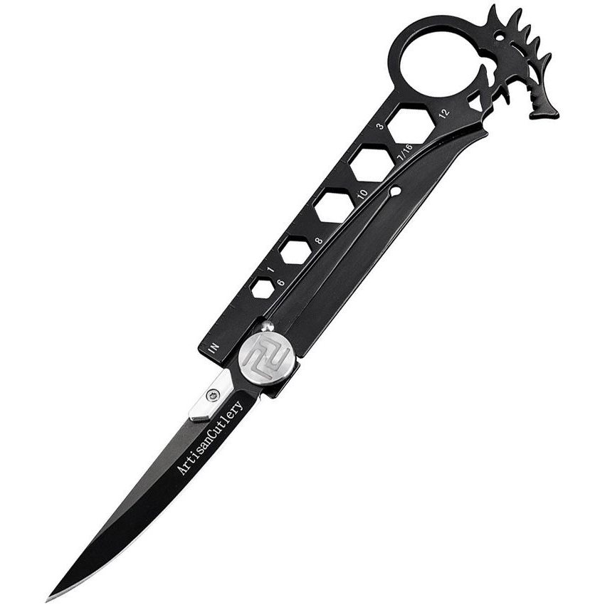 Elegante coltello multifunzionale dotato di chiavi esagonali posizionate nell'impugnatura e righello integrato. La lama del coltello è sottile, ha un filo liscio ed è realizzata in acciaio inossidabile AUS-8. Quando è aperto, è bloccato da un affidabile fermo FrameLock, mentre un cuscinetto a sfere in ceramica garantisce un'apertura facile e piacevole. Il manico è in acciaio e alla sua estremità si trova un foro per le dita e un apribottiglie a forma di testa di drago. Il coltello è fornito con un fodero in kydex nero da agganciare alla cintura.