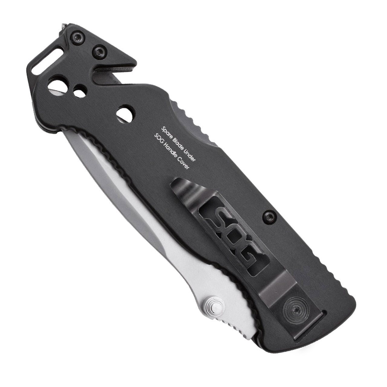Il manico è dotato di un taglierino (adatto per lenze, corde, spaghi, cinture di sicurezza, cinghie), un rompivetro e un isolatore di fili brevettato da SOG. Sul retro del manico si trova una clip metallica da tasca. Il manico include anche un affidabile blocco LockBack che blocca in modo sicuro il coltello in posizione aperta. Il manico è dotato anche di un affidabile blocco LockBack, che assicura il coltello in posizione aperta.