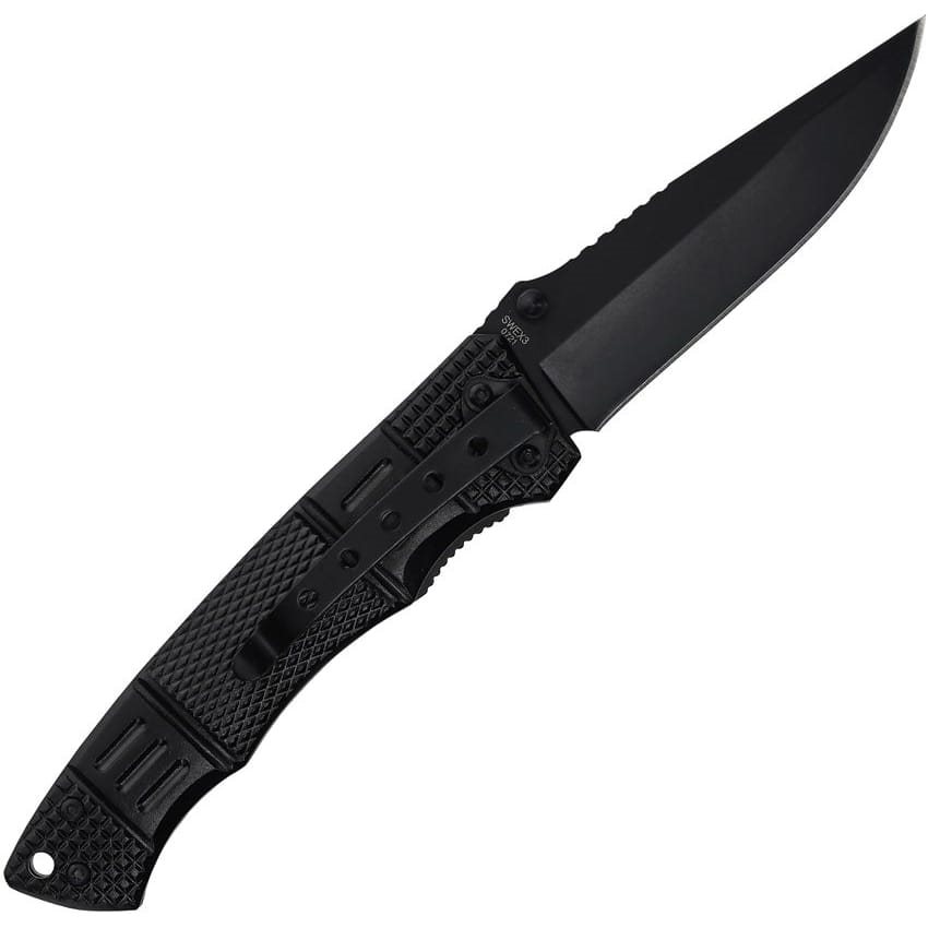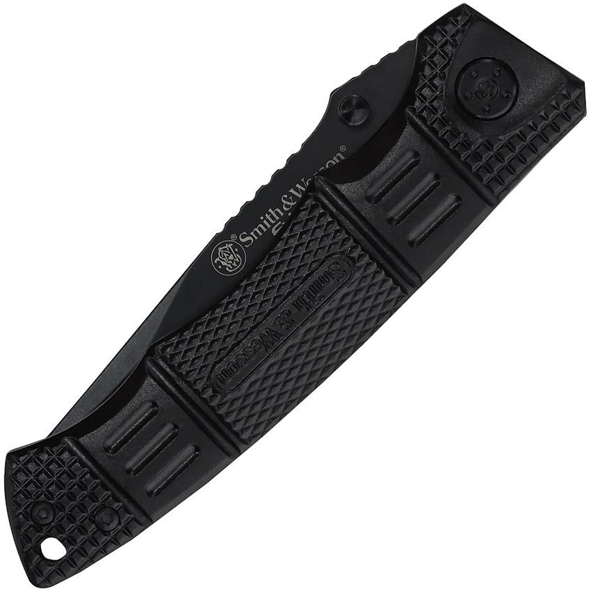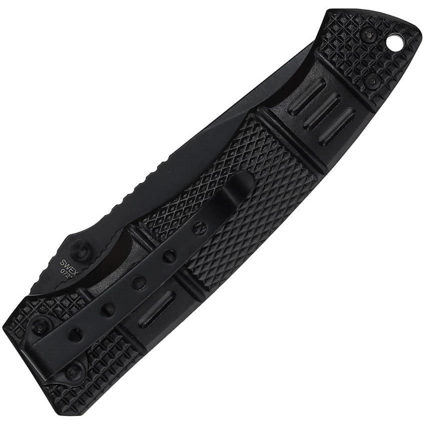 Coltello SWEX3 della serie Extreme Operations di Smith and Wesson. Acciaio inossidabile 400 e manico in alluminio con rivestimento speciale. Foro per cordino nella parte posteriore del manico.