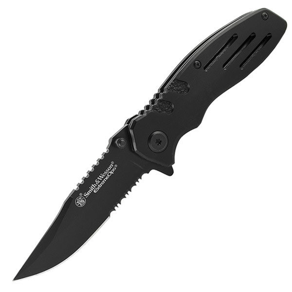 Coltello pieghevole Smith & Wesson con impugnatura in alluminio e lama in acciaio 7Cr17 con durezza 56-58HRc.