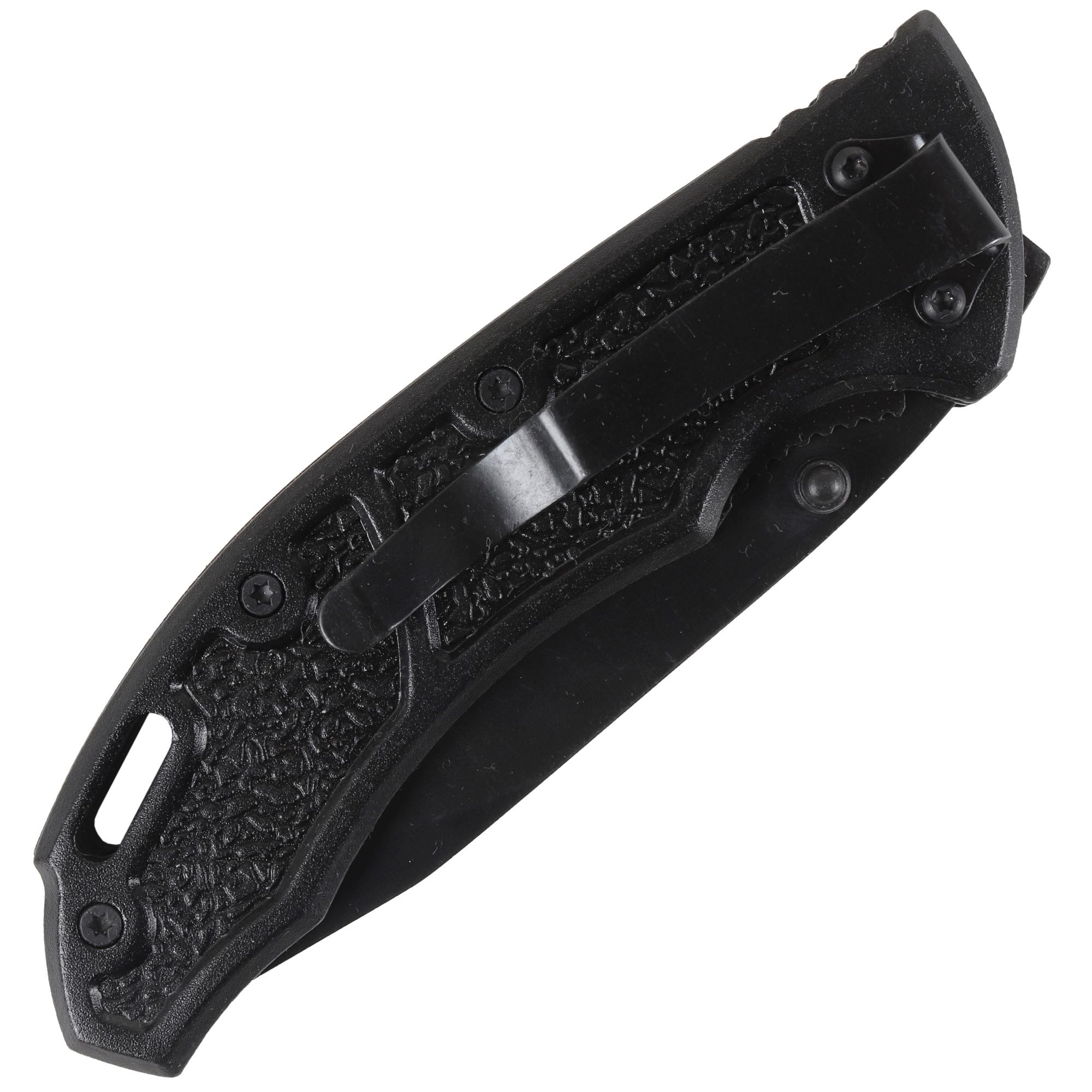 Coltello pieghevole interamente in metallo con impugnatura parzialmente in gomma e clip per il fissaggio alla cintura. Lama di tipo tanto con tagliente combinato. Lunghezza lama 8 cm, lunghezza totale 19 cm.