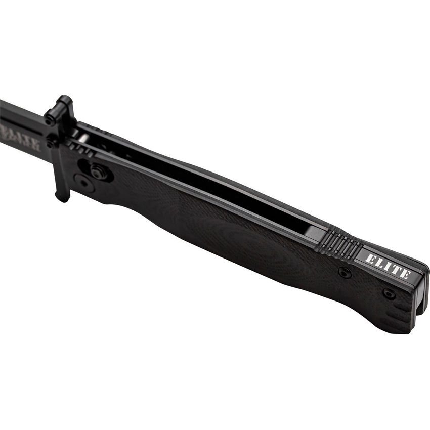 Coltello pieghevole EDC in versione completamente nera. La lama con filo liscio è realizzata in acciaio per utensili D2; quando è aperto, il coltello è bloccato da un fermo di sicurezza di tipo Rapid lock, il cui meccanismo di comando si trova nella parte anteriore del manico. Per una rapida apertura con una sola mano è presente una barra con perno su entrambi i lati che, una volta aperta la lama, si trasforma in una semplice protezione. Il manico è sagomato per una presa comoda e sicura. I suoi rinforzi sono realizzati in fibra di nylon rinforzata. Il coltello è dotato di una clip da tasca in metallo.
