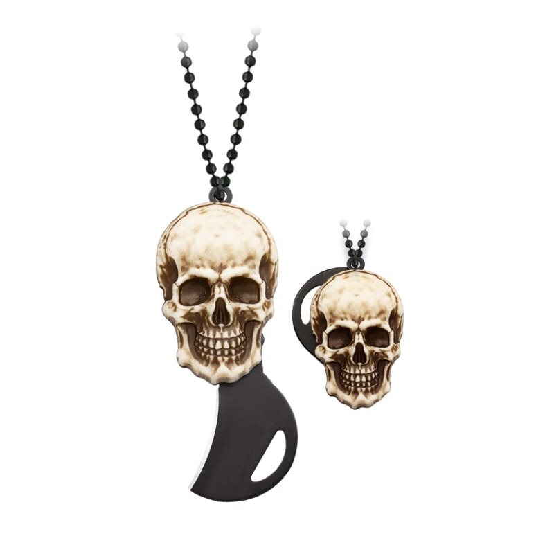 Ciondolo a forma di teschio che nasconde un piccolo coltellino in acciaio inossidabile. La lama è annerita, dotata di un filo liscio e di un'incisione pronunciata per facilitarne l'apertura. Il teschio è realizzato in plastica ABS modellata, la catena è in metallo.