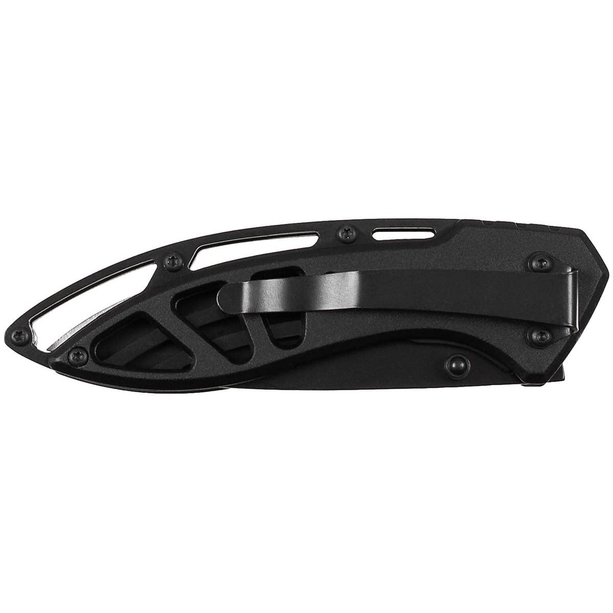 Coltello pieghevole interamente in metallo con clip per il fissaggio alla cintura.