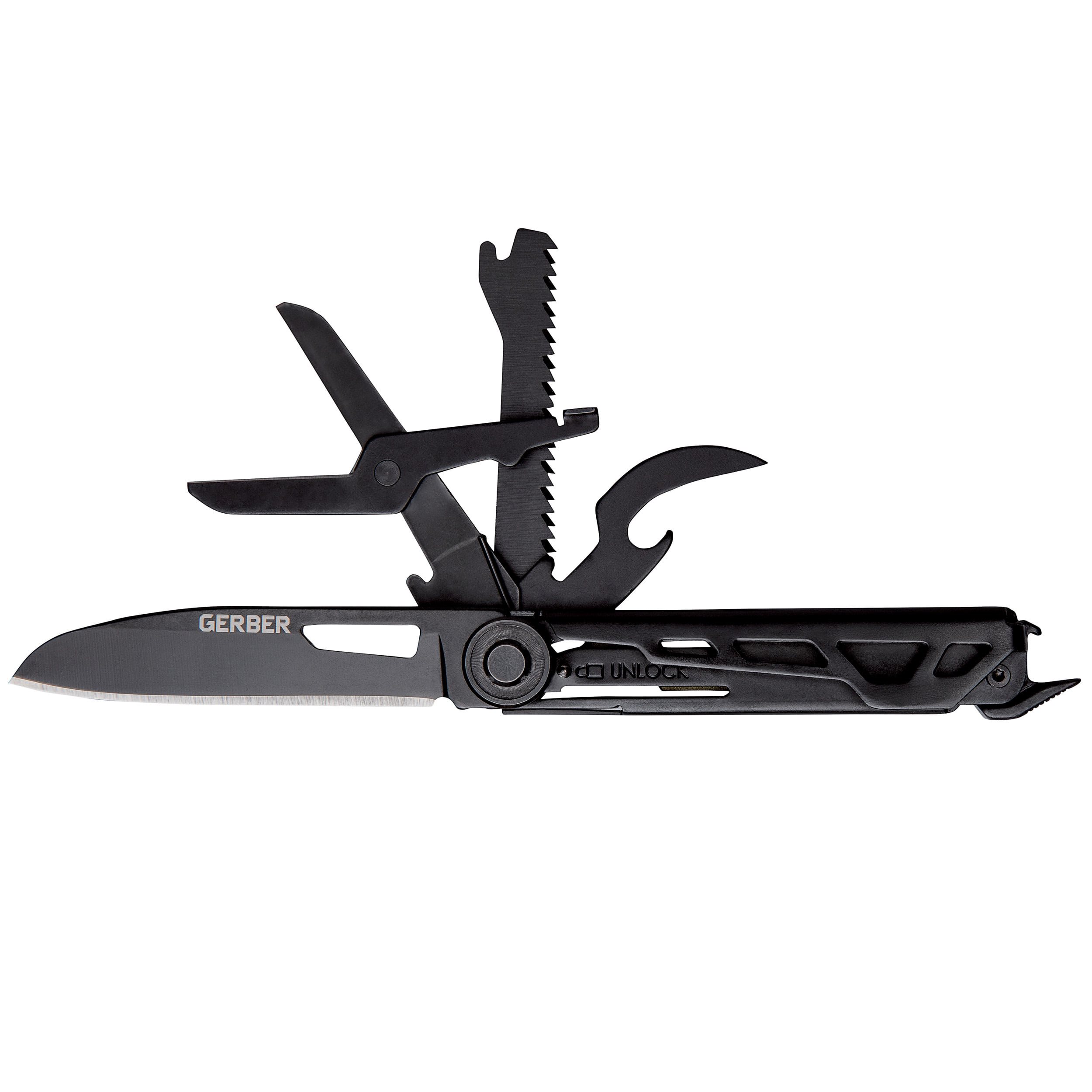 Coltello multifunzionale da esterno che offre ben sette pratici strumenti. Grazie alle sue dimensioni compatte (circa 9 cm di lunghezza quando è chiuso) e alla clip in metallo, sta comodamente in tasca ed è quindi ideale da portare con sé ogni giorno al lavoro e nella natura. La lama del coltello è realizzata in acciaio inossidabile 5Cr15MoV con rivestimento nero e dispone di un dispositivo di sicurezza. I rinforzi del manico sono realizzati in alluminio per ridurne il peso.