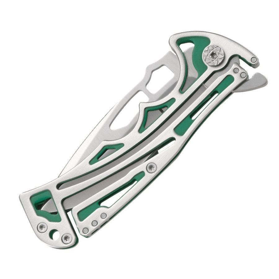 Il manico aerato è sorprendentemente comodo da impugnare. È realizzato in acciaio inossidabile bicolore, argento e verde brillante. All'estremità è presente un foro per il passaggio di un cordino, mentre sul retro è posizionato un clip da tasca in metallo. Il coltello è bloccato in posizione aperta dal sistema di sicurezza Klecker Lock, che funziona in modo simile al BackLock per quanto riguarda la chiusura. Premendo la parte posteriore superiore della parte mobile del manico, la lama si sblocca. La lama è liscia.