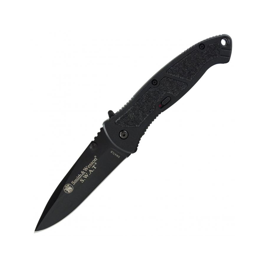 Coltello della serie S.W.A.T. della ditta Smith & Wesson con lama liscia e apertura assistita M.A.G.I.C. È possibile iniziare ad aprire il coltello con il pollice come gli altri coltelli e la lama completerà il movimento, oppure è possibile premere il fermo con l'indice. Lama in acciaio inossidabile 4034 e manico in alluminio con impugnatura zigrinata.