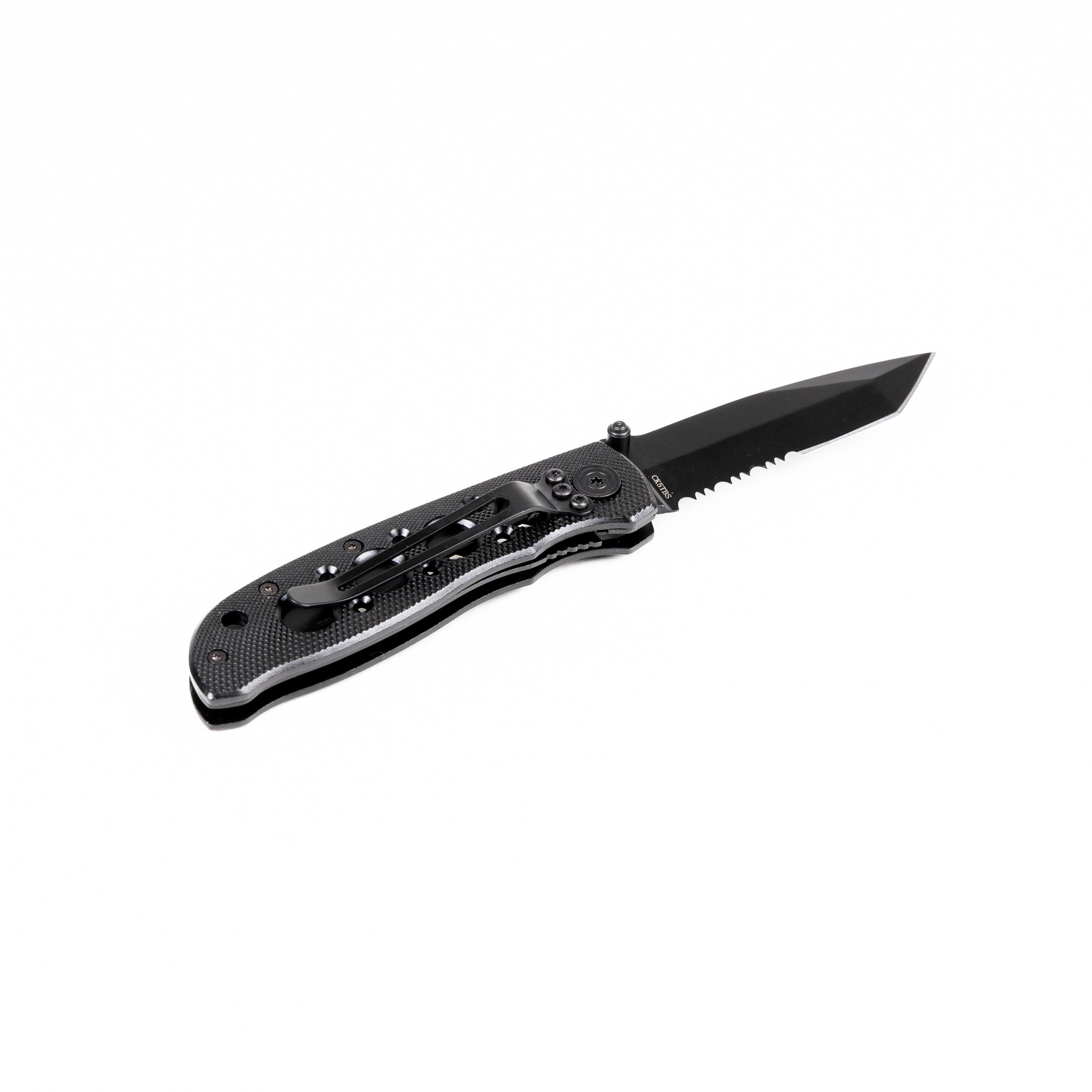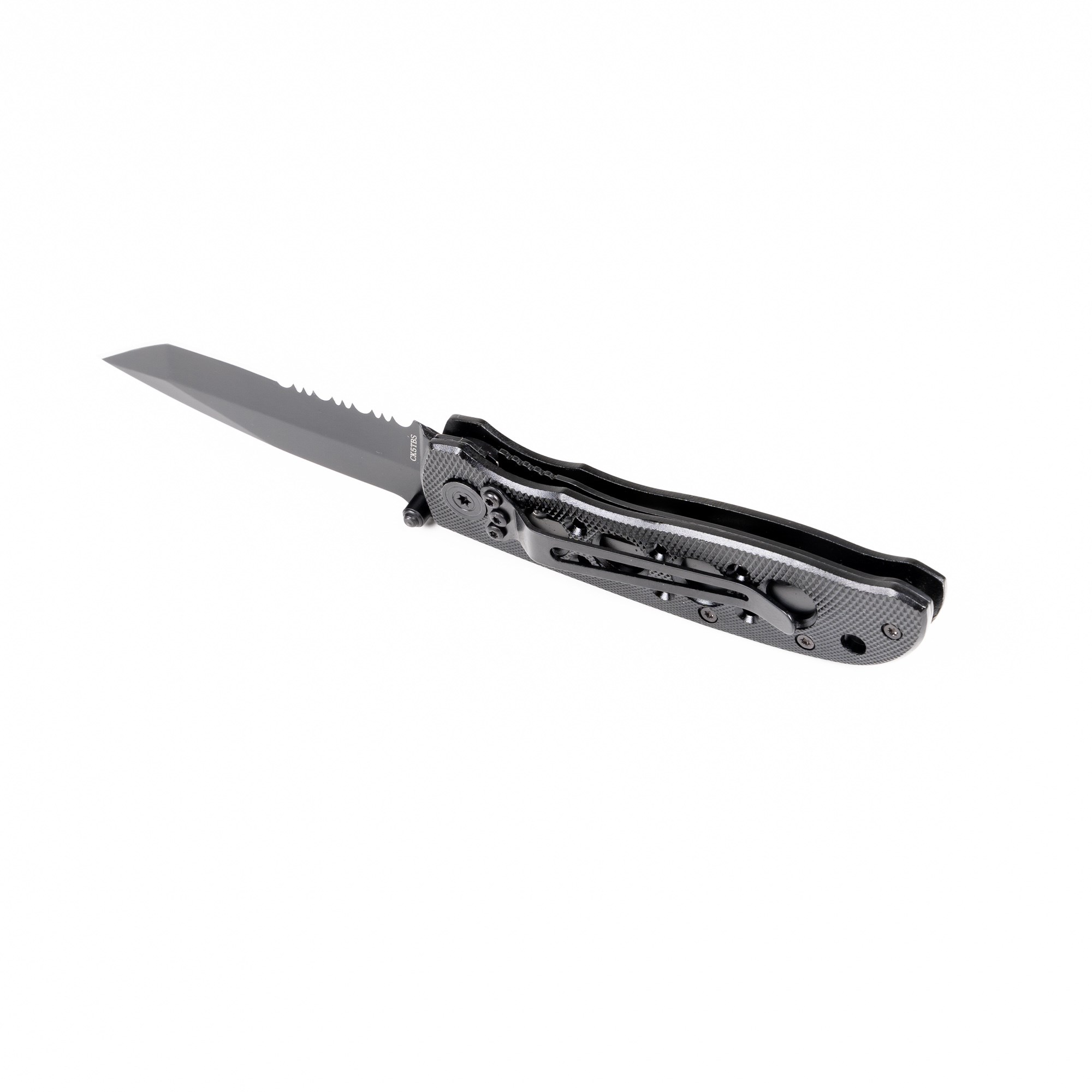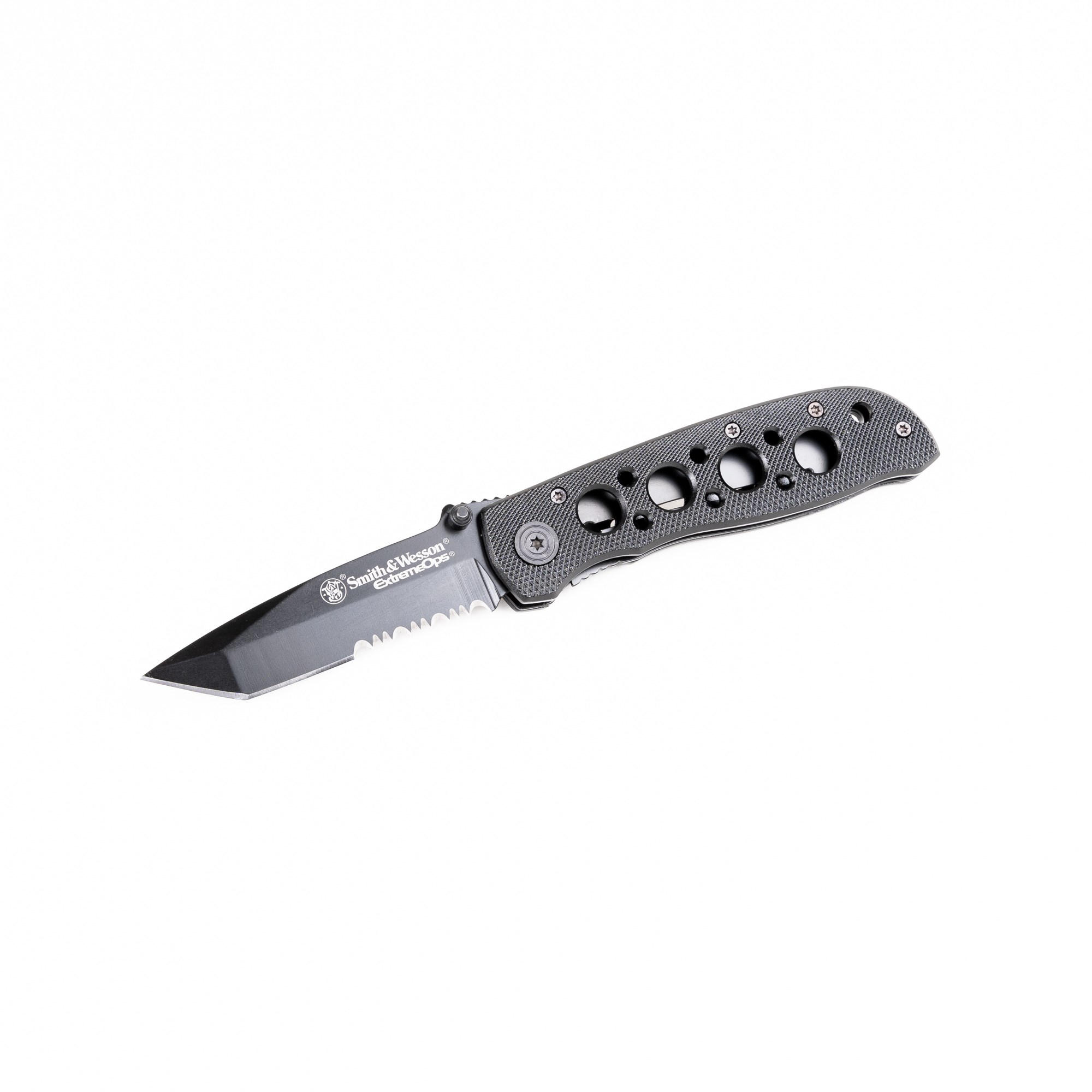 Il rinomato coltello a serramanico Smith & Wesson con lama parzialmente seghettata. La lama è in acciaio inossidabile con finitura nera, il manico è in alluminio, dotato di clip per il fissaggio alla cintura o alla tasca.