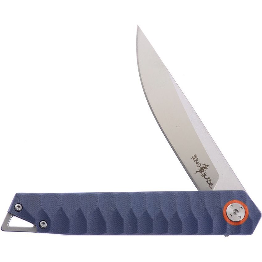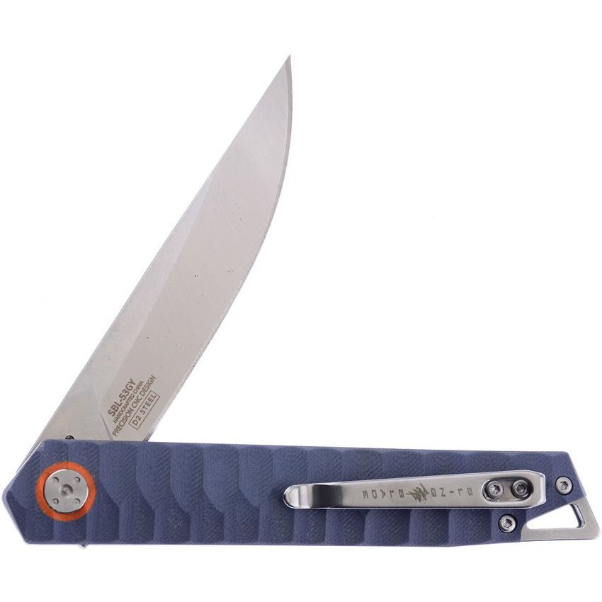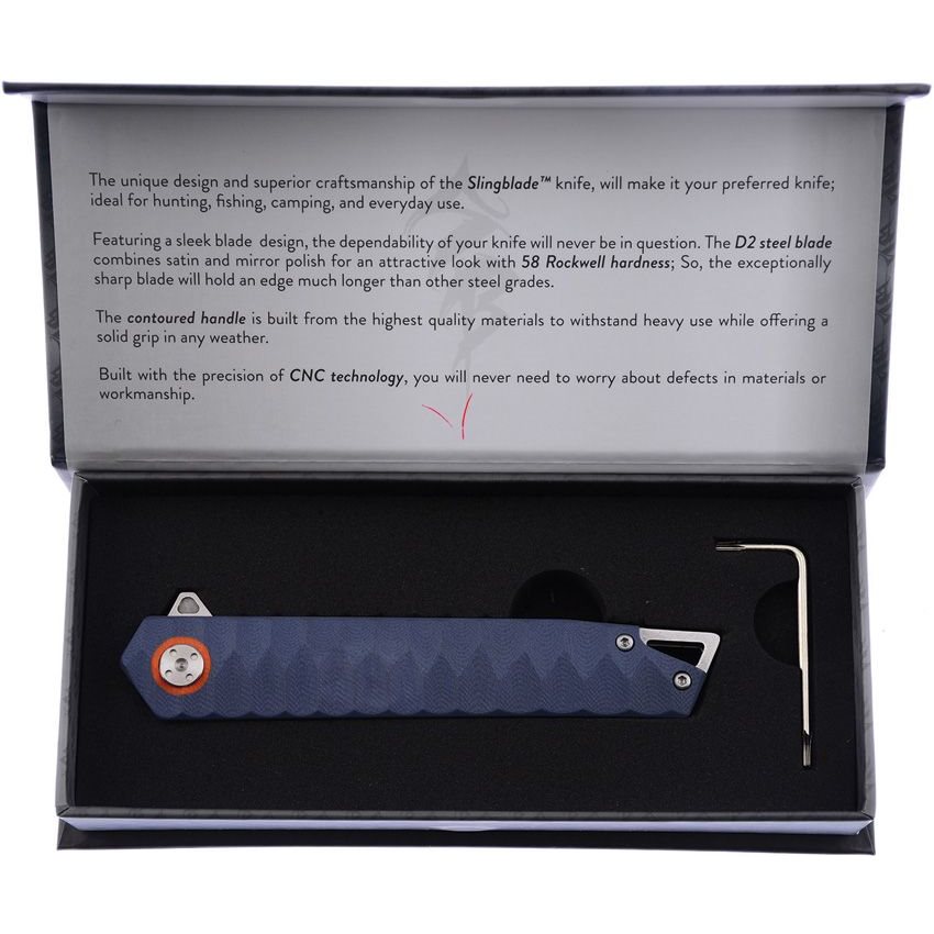Elegante coltello EDC fornito in confezione regalo. La lama con filo liscio a forma di drop point è realizzata in acciaio per utensili D2. Il manico è in materiale G10 antiscivolo di colore blu. Il manico è dotato di clip metallica da tasca e foro per il passaggio del cordino di sicurezza.