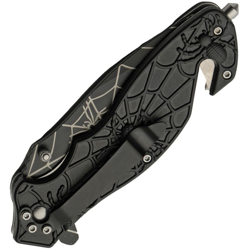 Coltello pieghevole con immagini di ragni e ragnatele. Materiale della lama con lama combinata: acciaio inossidabile; materiale del manico: plastica ABS. Clip da tasca, chiusura di sicurezza LinerLock, rompivetro, taglierina per cinture. Ulteriori informazioni