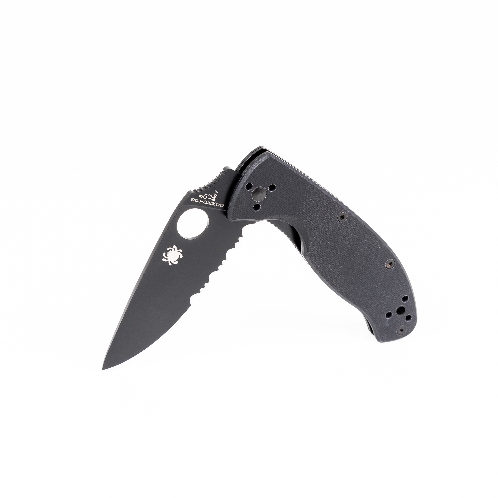 Coltello pieghevole Spyderco con lama nera e lama parzialmente seghettata.