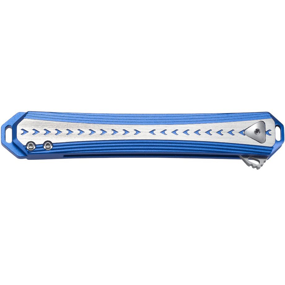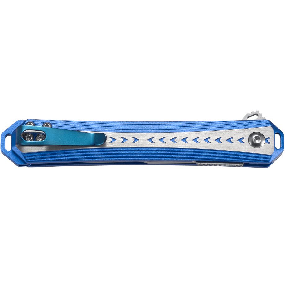 Il manico, in una combinazione di colori blu e argento, è realizzato in alluminio. Grazie a ciò, è leggero e allo stesso tempo resistente. Sul retro del manico si trova una clip da tasca in metallo e alla sua estremità è presente un foro che consente di agganciare il coltello al cinturone. questo è leggero e allo stesso tempo resistente. Sul retro dell'impugnatura si trova una clip da tasca in metallo e all'estremità è presente un foro per poter infilare un cordino. L'impugnatura è dotata anche di un fermo LinerLock che blocca il coltello in posizione aperta in modo affidabile. Il coltello è stato progettato dal designer di coltelli Jeff Park.