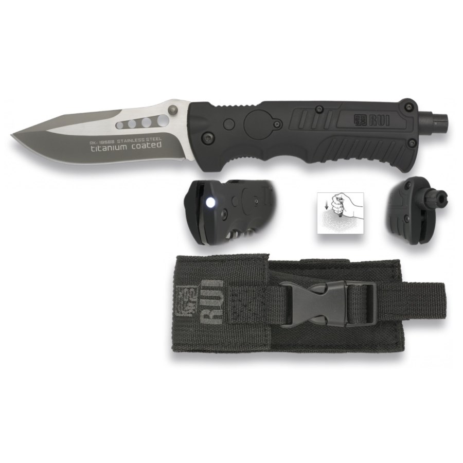 Coltello pieghevole del marchio spagnolo RUI TACTICAL. La lama è realizzata in acciaio inossidabile con rivestimento in titanio che ne migliora le proprietà. Il filo ha una levigatura liscia ed è caratterizzato da un'elevata affilatura. Per il manico è stato utilizzato alluminio, rivestito in gomma per una migliore presa. Nel manico si trovano anche una luce LED di emergenza e un rompivetro. Il coltello è fornito con un robusto fodero in nylon.