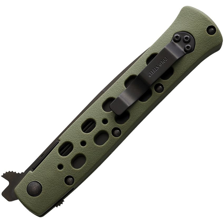 Elegante coltello pieghevole ideale per l'uso quotidiano. La lama sottile con tagliente liscio è realizzata in acciaio giapponese AUS-8A con finitura nera. Per una facile apertura con una sola mano, è possibile utilizzare il flipper relativamente pronunciato e il perno su entrambi i lati. Una volta aperta, la lama è bloccata da un fermo Spring leaf lock, ovvero un Linerlock migliorato con un fermo di sicurezza azionato da un sottile elemento sul manico. Il manico stesso è relativamente sottile ed è stato realizzato con Zytel®, un materiale molto resistente, ovvero un poliammide termoplastico (nylon) con un ottimo rapporto tra peso ridotto e alta resistenza all'abrasione. Per ridurre il peso, il manico è perforato a intervalli regolari. Per un comodo trasporto, il coltello è dotato di una clip da tasca in metallo.