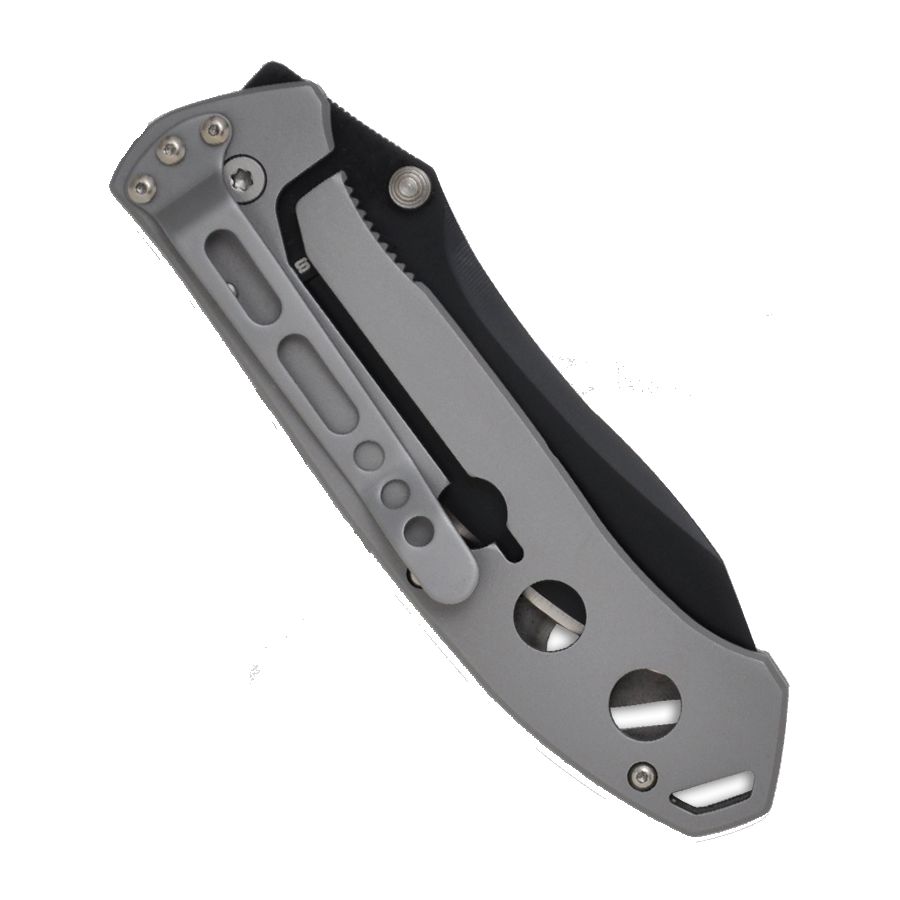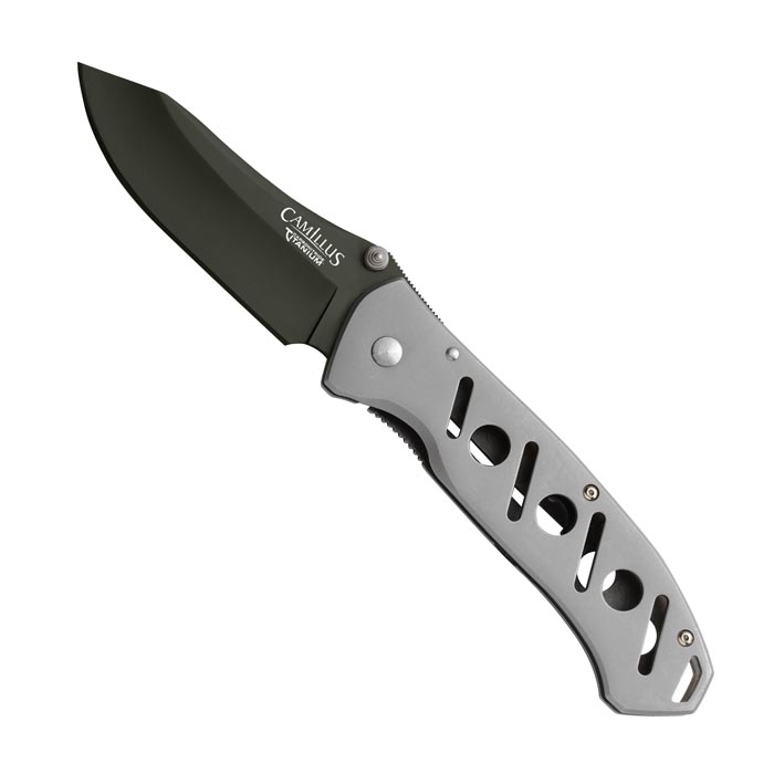 Coltello con lama realizzata in acciaio inossidabile giapponese AUS-8 di alta qualità, rivestita in carbonitruro di titanio per una maggiore resistenza. Sulla lama nera è presente un perno su entrambi i lati che consente di aprire il coltello con una sola mano. I manici grigi opachi sono realizzati in alluminio leggero e resistente e sono ergonomicamente sagomati. I fori nei manici non solo creano un design interessante, ma rendono anche il coltello più leggero e antiscivolo. Sul retro è presente un foro che consente di agganciare il coltello al cinturone. ergonomicamente sagomati. I fori nei manici non solo creano un design interessante, ma rendono anche il coltello più leggero e antiscivolo. Sul retro è presente una clip da tasca in metallo che può essere rimossa. Una sicura protegge il coltello da una chiusura involontaria. Il produttore di coltelli CAMILLUS vanta una tradizione che risale alla fine del XIX secolo.