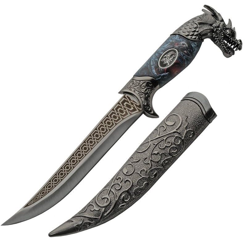 Lama con filo liscio, il manico è terminato con una testa di drago prominente.
