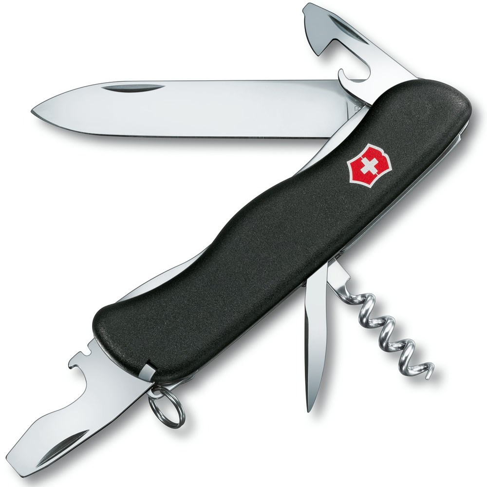 Coltello tascabile con sicura a pressione contro la lama e manico nero, dotato di 11 funzioni: lama di sicurezza, cavatappi, apriscatole, cacciavite stretto, apribottiglie, cacciavite, spellacavi, punteruolo e punzone, anello, pinzetta, Ulteriori informazioni