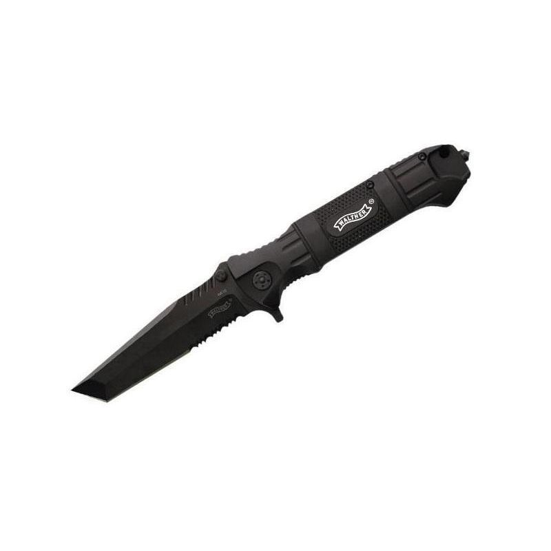 Coltello tattico della ditta Walther. La lama nera a forma di tanto è realizzata in acciaio inossidabile 440 e dispone di un tagliente combinato, un flipper e un perno per una facile apertura con una sola mano. Quando è aperto, il coltello è bloccato da una sicura LinerLock. Il manico in alluminio è comodo da impugnare e alla sua estremità si trova una punta per rompere il vetro; naturalmente è presente anche una clip da tasca in metallo.
