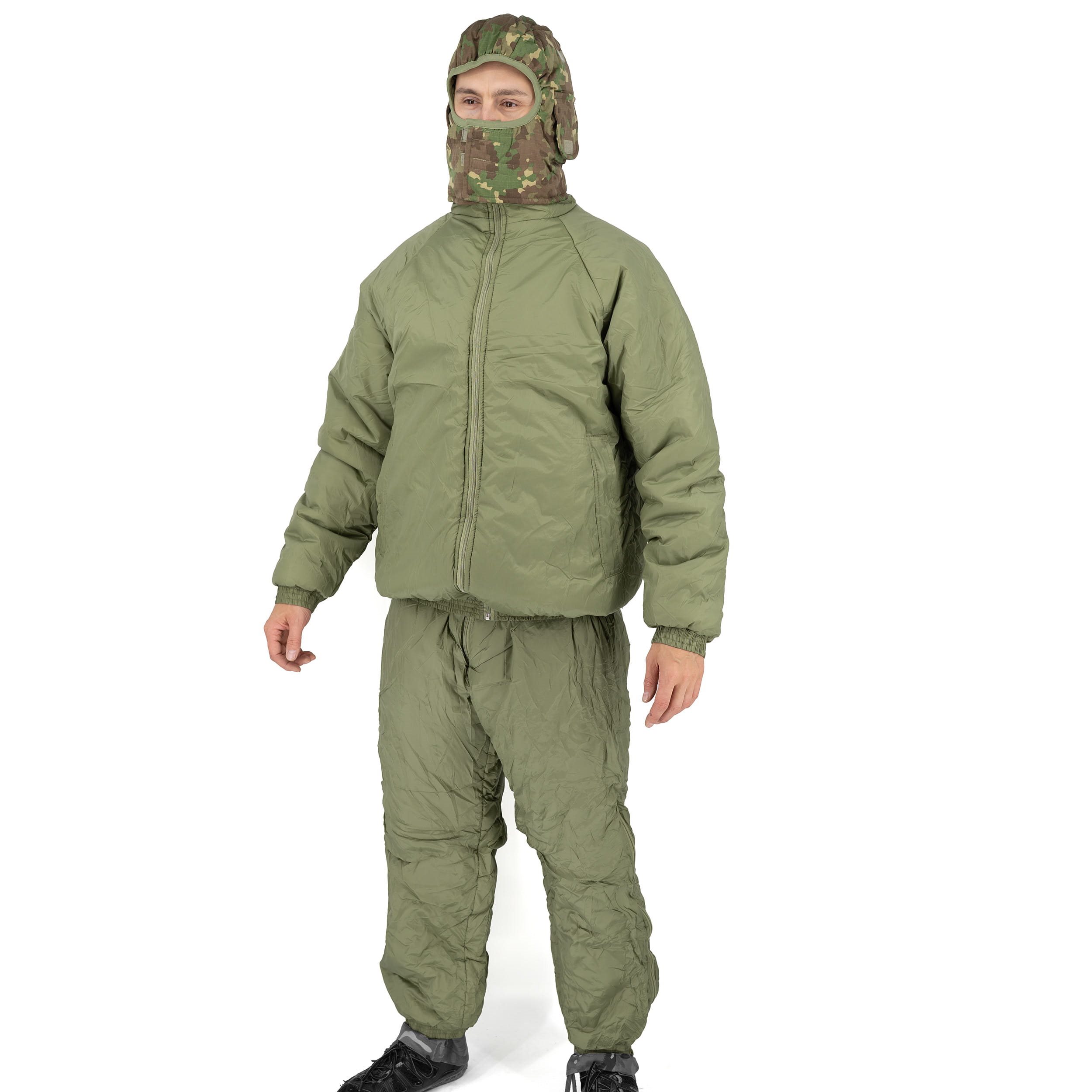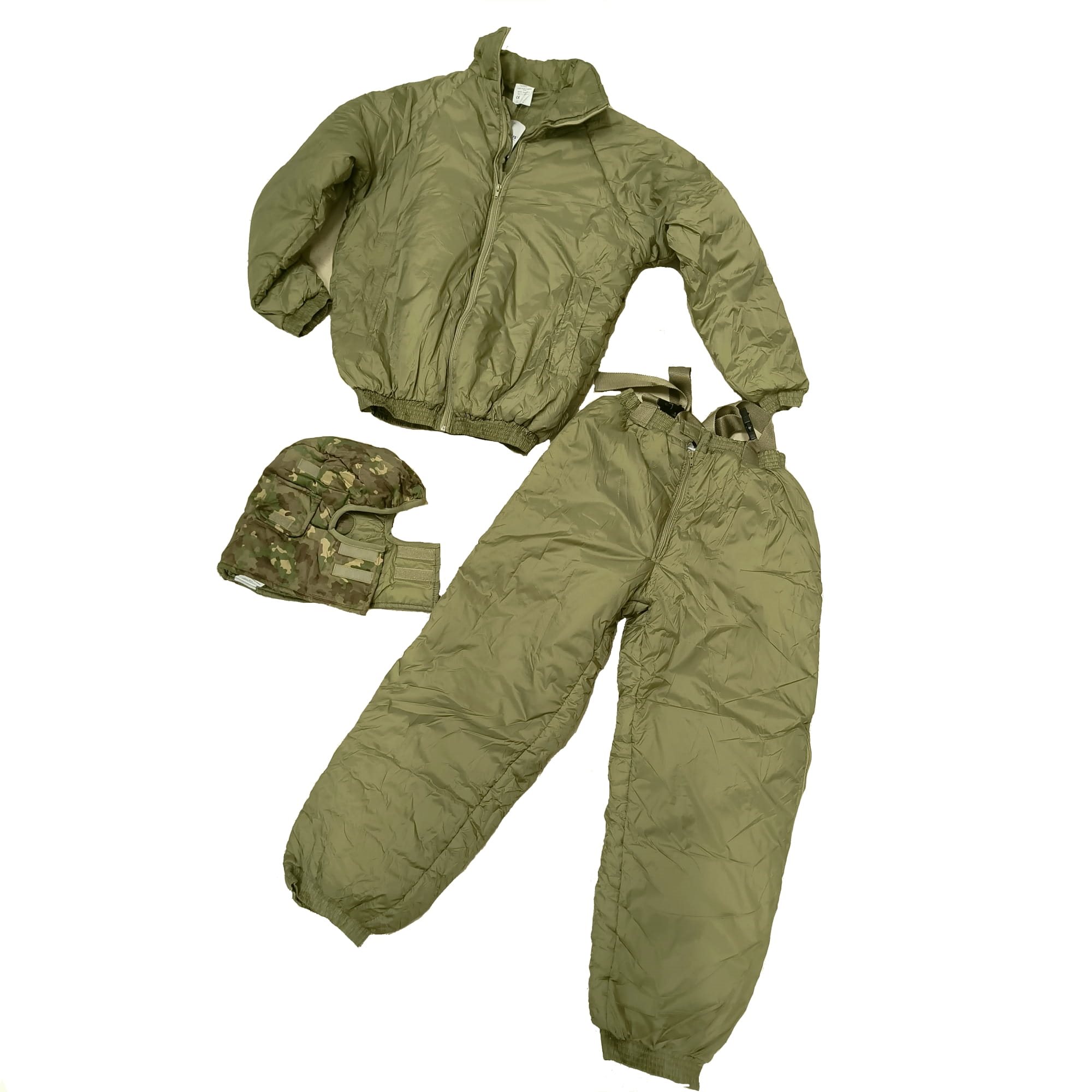 Il set completo per il freddo comprende una giacca termoisolante e pantaloni termoisolanti, oltre a un cappuccio/passamontagna mimetico. Produttore rumeno INVICTUS.
