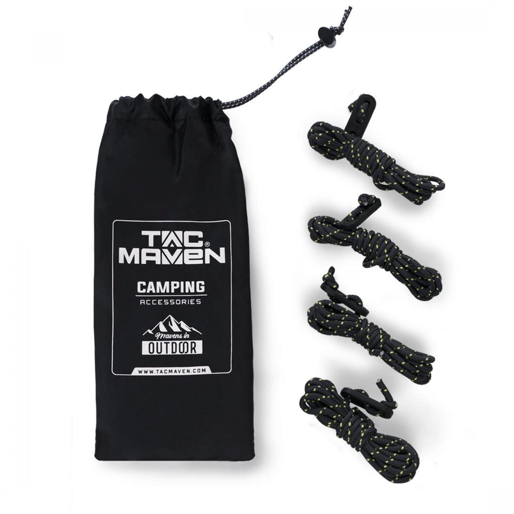 Set di quattro corde riflettenti con tenditore integrato. Le corde sono realizzate con sette fili di poliestere ad altissima resistenza. Ogni corda ha una lunghezza di 2,2 metri, ideale per fissare tende, vele, amache e altre attrezzature da campeggio. Ad un'estremità è posizionato un tenditore che consente una regolazione rapida e affidabile della tensione. Gli elementi riflettenti integrati aumentano la visibilità e la sicurezza durante l'uso notturno. Fornito con una pratica custodia per il trasporto.