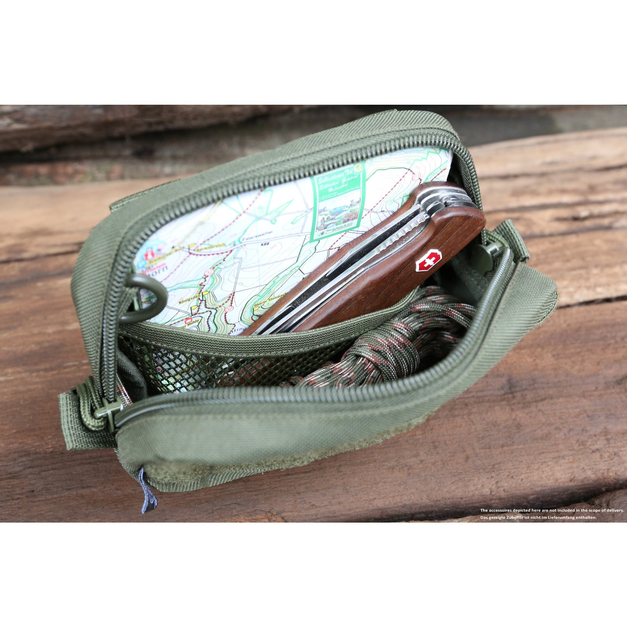 Custodia universale resistente dotata di sistema di aggancio MOLLE/PALS sia sul lato anteriore che su quello posteriore. Sul lato anteriore è presente un semplice pannello in VELCRO, ideale per fissare le vostre toppe. Lo scomparto principale è accessibile tramite una cerniera a doppio cursore, all'interno si trova un piccolo scomparto in rete e un anello a D in plastica. L'intera custodia può essere fissata alla cintura.