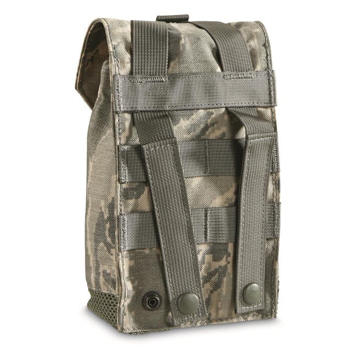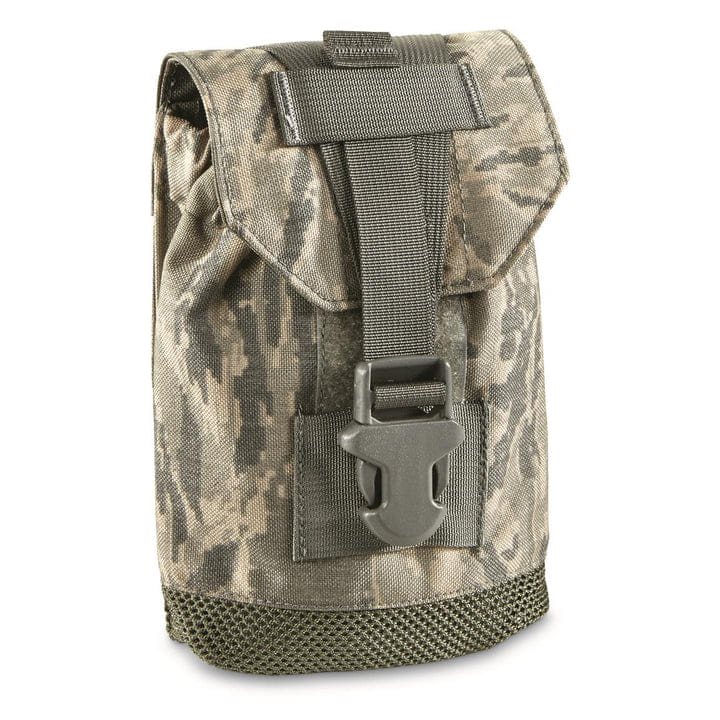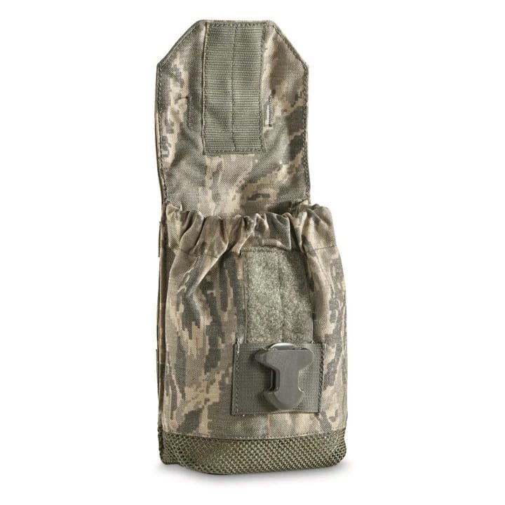 Fondina originale dell'esercito americano progettata per il trasporto di borracce da campo. La fondina è realizzata in resistente nylon rip-stop 1000D con rivestimento idrorepellente. La parte superiore della fondina è chiusa con un cordino con fermo e il lembo esterno è fissato con una cinghia con fibbia in plastica. Il retro della custodia è dotato di interfaccia MOLLE/PALS per il fissaggio ad attrezzature compatibili.