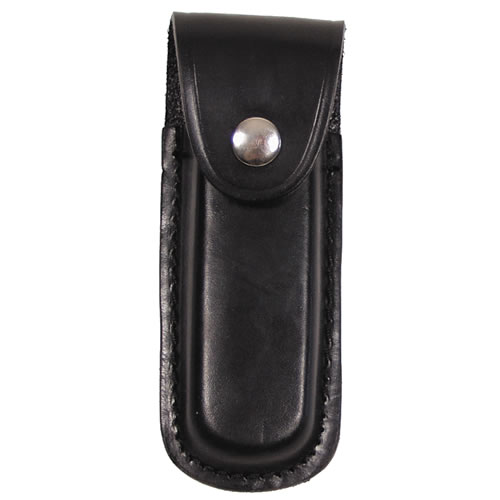 Custodia in pelle per coltello, chiusura con bottone a pressione, sul retro aperture per il fissaggio alla cintura (per cinture fino a 6 cm).