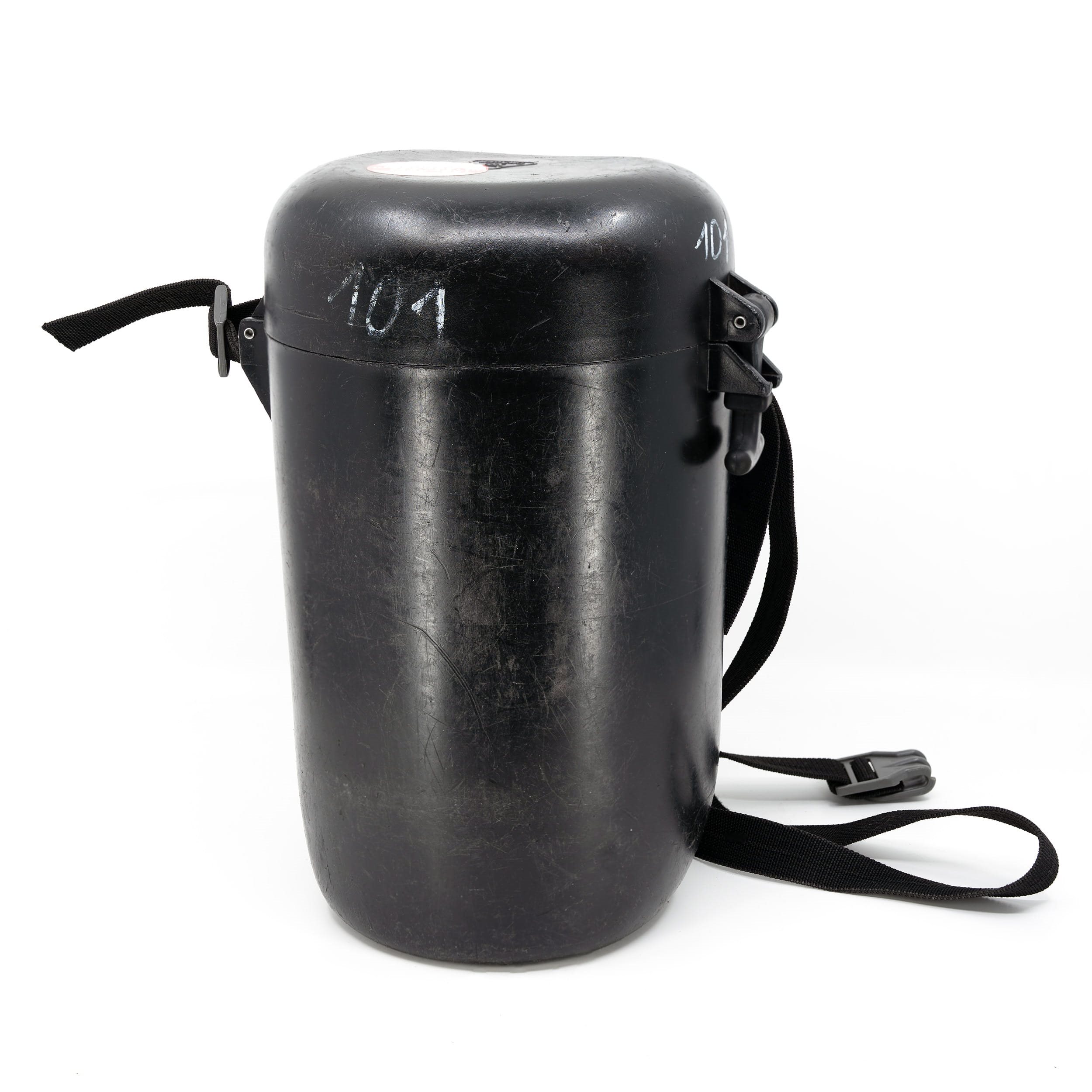 Scatola di plastica per riporre la maschera con tracolla. Utilizzata in condizioni funzionali.