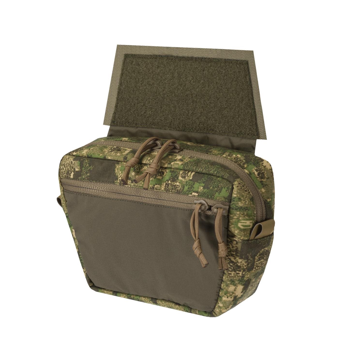 Pratica custodia inferiore fissabile a tutti i supporti per piastre con chiusura in velcro. La custodia dispone di tre tasche. La tasca principale è parzialmente rivestita in morbido pile, la tasca anteriore è in nylon elastico a quattro vie e la tasca posteriore è destinata all'inserimento di morbida balistica. Nella parte inferiore della custodia sono presenti due passanti metallici e un sistema di aggancio MOLLE/PALS ridotto.