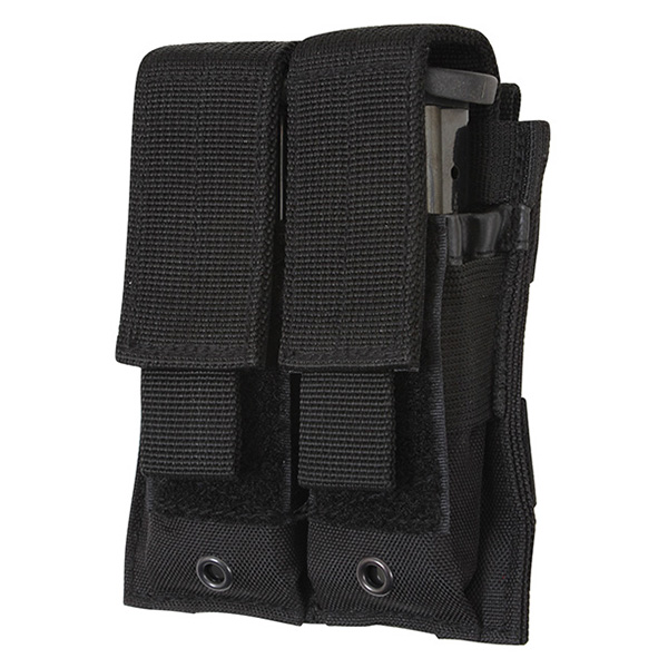 Doppia custodia per caricatori di pistola, compatibile con MOLLE. Patta con chiusura in velcro. Dimensioni: 11 x 12,5 cm. Materiale: poliestere 600D.