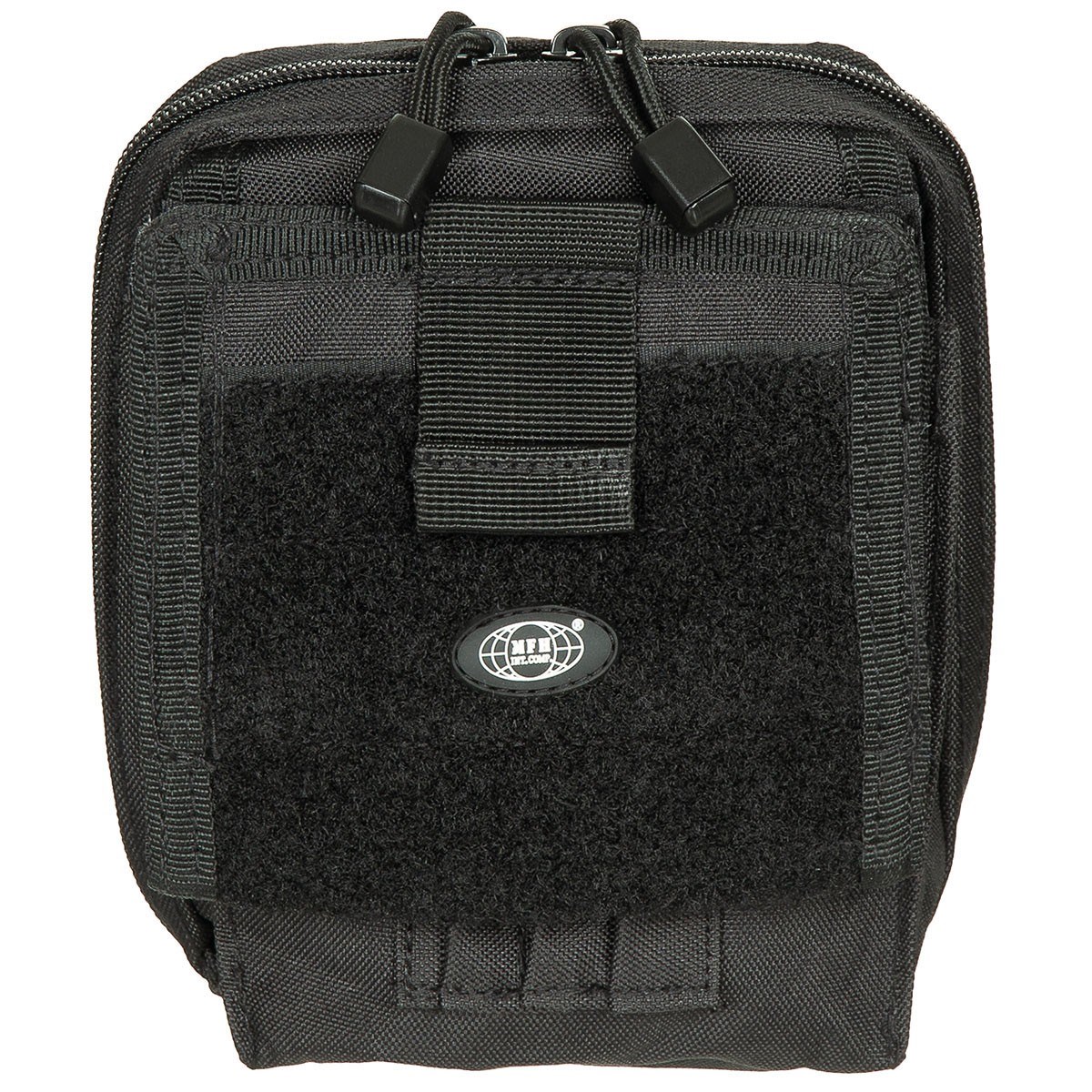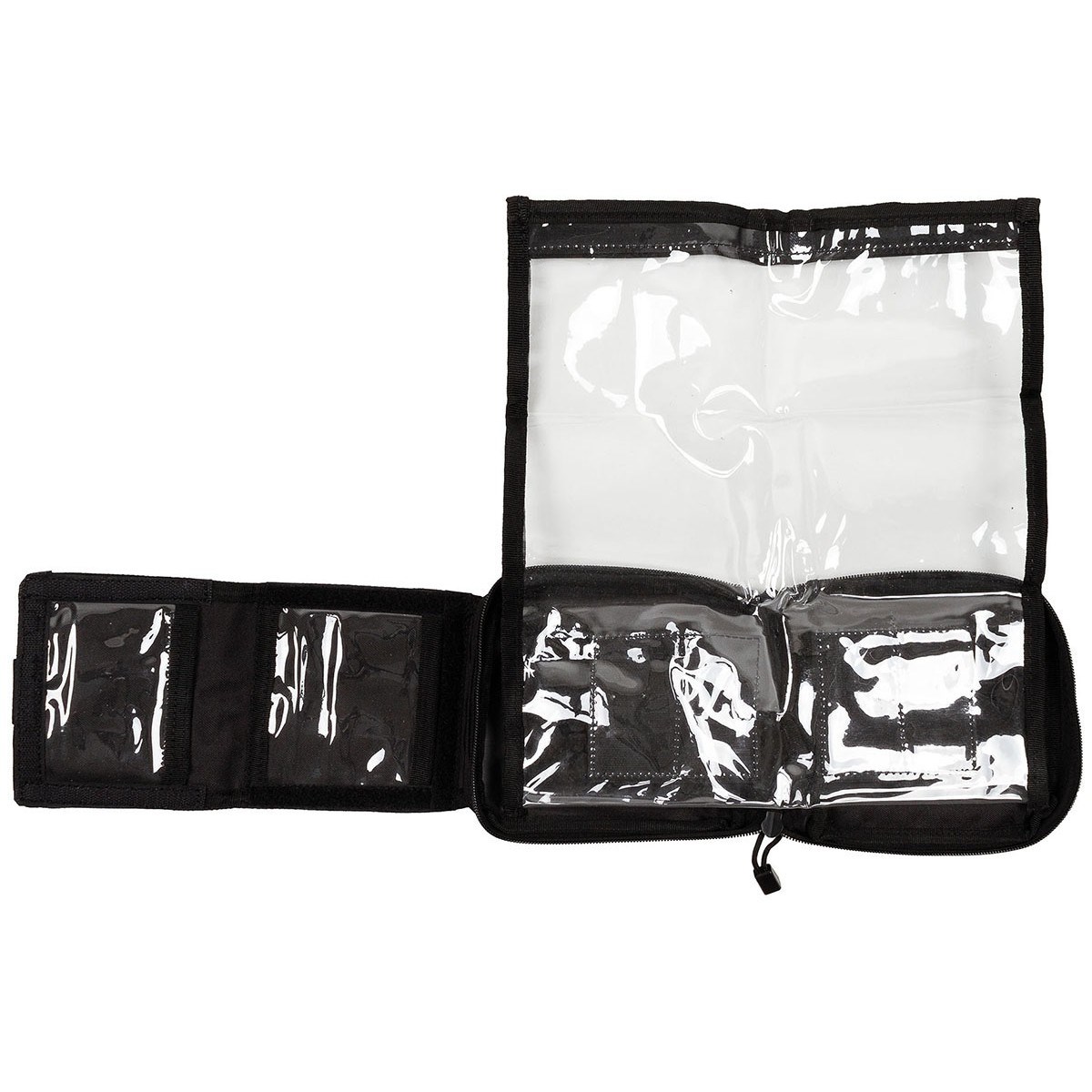 Sul lato anteriore è presente una patta pieghevole, all'interno della quale si trovano due finestre trasparenti per documenti di identità, mentre all'esterno è presente un pannello con chiusura in velcro.