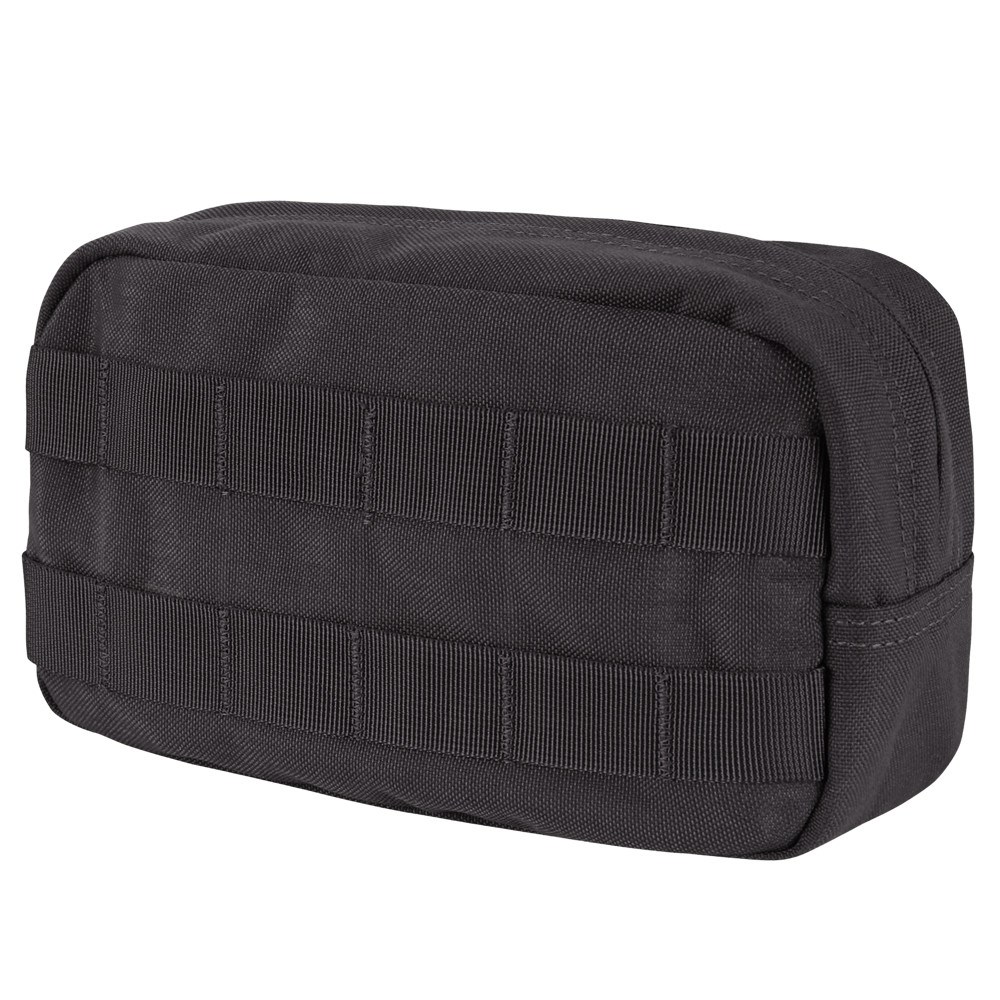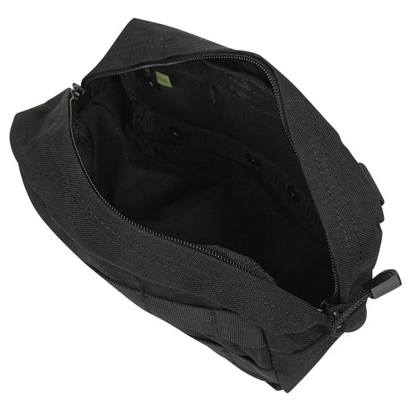 Tasca orizzontale universale per il fissaggio al sistema MOLLE. Sul lato anteriore due file di passanti PALS, chiusura con cerniera a doppio cursore, sul lato posteriore 4 nastri per il fissaggio alle cinghie, terminanti con bottoni a pressione.