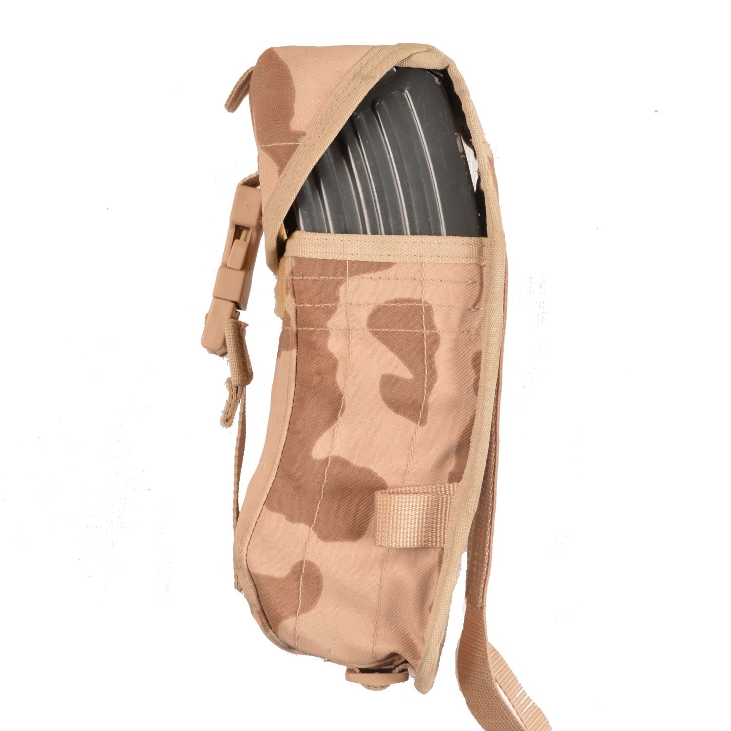Custodia per tre caricatori del fucile automatico SA58. I caricatori sono disposti uno accanto all'altro in verticale. Chiusura con patta e fibbia Fastex. Fissaggio tramite sistema MOLLE NPP-2006. Usato - svendita dell'esercito ceco, in buone condizioni, non danneggiato.