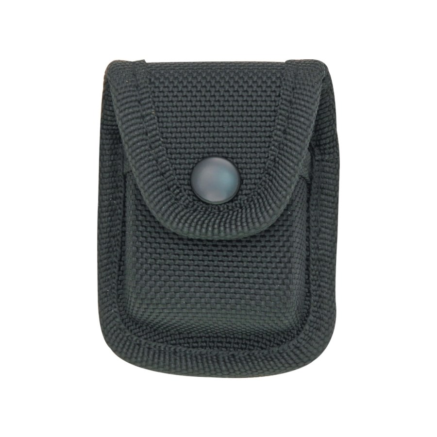 Custodia in nylon per accendini, adatta per accendini di tipo ZIPPO e simili. La custodia è rinforzata, può essere fissata alla cintura con un passante di circa 5 cm di larghezza e si chiude con un bottone a pressione in metallo. Dimensioni: circa 6 x 4 x 1,8 cm.