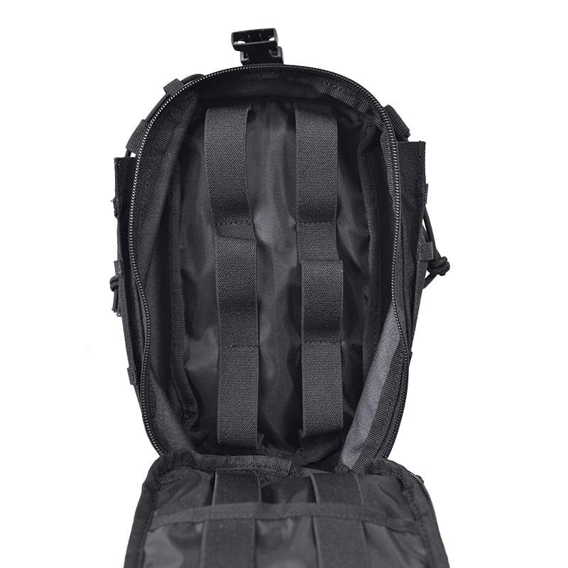 Sui lati e sulla parte anteriore della borsa è presente un sistema di aggancio MOLLE/PALS ridotto, ideale per accessori più piccoli. I lati sono dotati di piccole tasche destinate al trasporto di lacci emostatici o caricatori da 5,56 mm (il contenuto delle tasche può essere fissato con elastici). Sul retro è presente un pannello a strappo in velcro standard MOLLE/PALS, destinato al fissaggio della cassetta di pronto soccorso allo zaino o alla cintura. Una volta staccato il pannello, è possibile fissare la cassetta di pronto soccorso su superfici con velcro. L'interno della cassetta è accessibile tramite una cerniera a doppio cursore e all'interno si trovano delle fasce elastiche che servono per fissare il materiale sanitario. Se si desidera personalizzare l'attrezzatura con toppe o etichette, si apprezzerà sicuramente l'ampio pannello frontale in velcro. La cassetta di pronto soccorso viene fornita senza materiale sanitario.