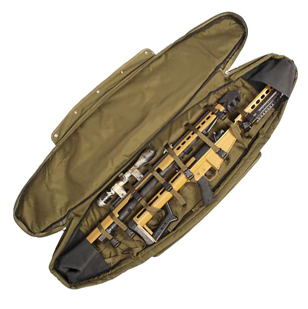 L'interno della custodia è imbottito e per fissare l'arma e gli accessori è presente una trama MOLLE con una serie di cinghie. In questo modo è possibile trasportare in sicurezza armi più lunghe in posizione smontata.