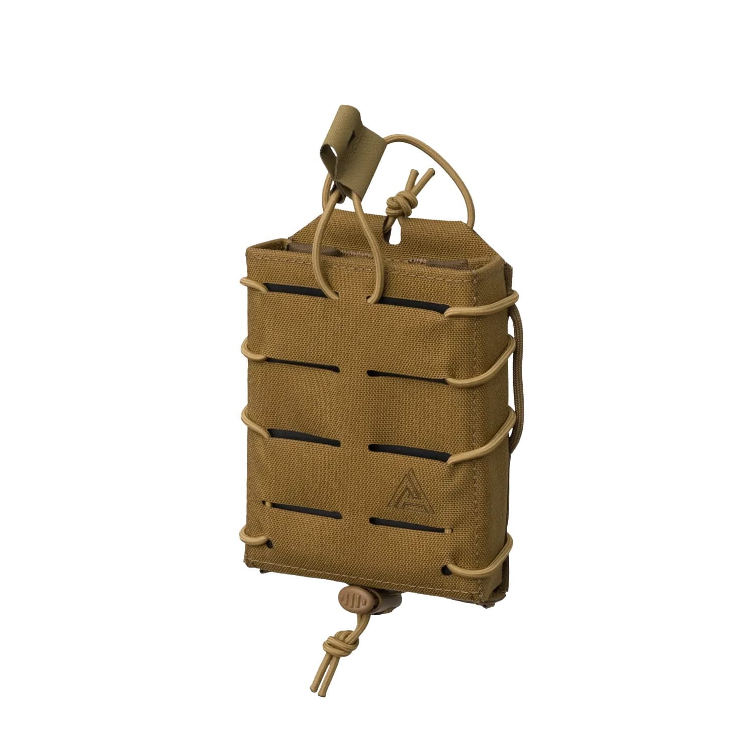 Marsupio aperto progettato per caricatori calibro .308 (AR10, HK417, M14, FAL ecc.). La chiusura superiore con cordino elastico e tirante in hypalon impedisce la perdita del caricatore durante attività dinamiche (ad es. lancio con paracadute), consentendo comunque di estrarre il caricatore in modo rapido e silenzioso. La custodia può essere utilizzata anche senza chiusura superiore, in quanto funziona come auto-bloccante grazie alla fodera interna in hypalon e all'allacciatura elastica regolabile sui lati. La custodia è rinforzata per facilitare l'inserimento del caricatore con una sola mano. L'attacco PALS/MOLLE laserato di alta qualità sul lato anteriore della custodia consente di sovrapporre più custodie.