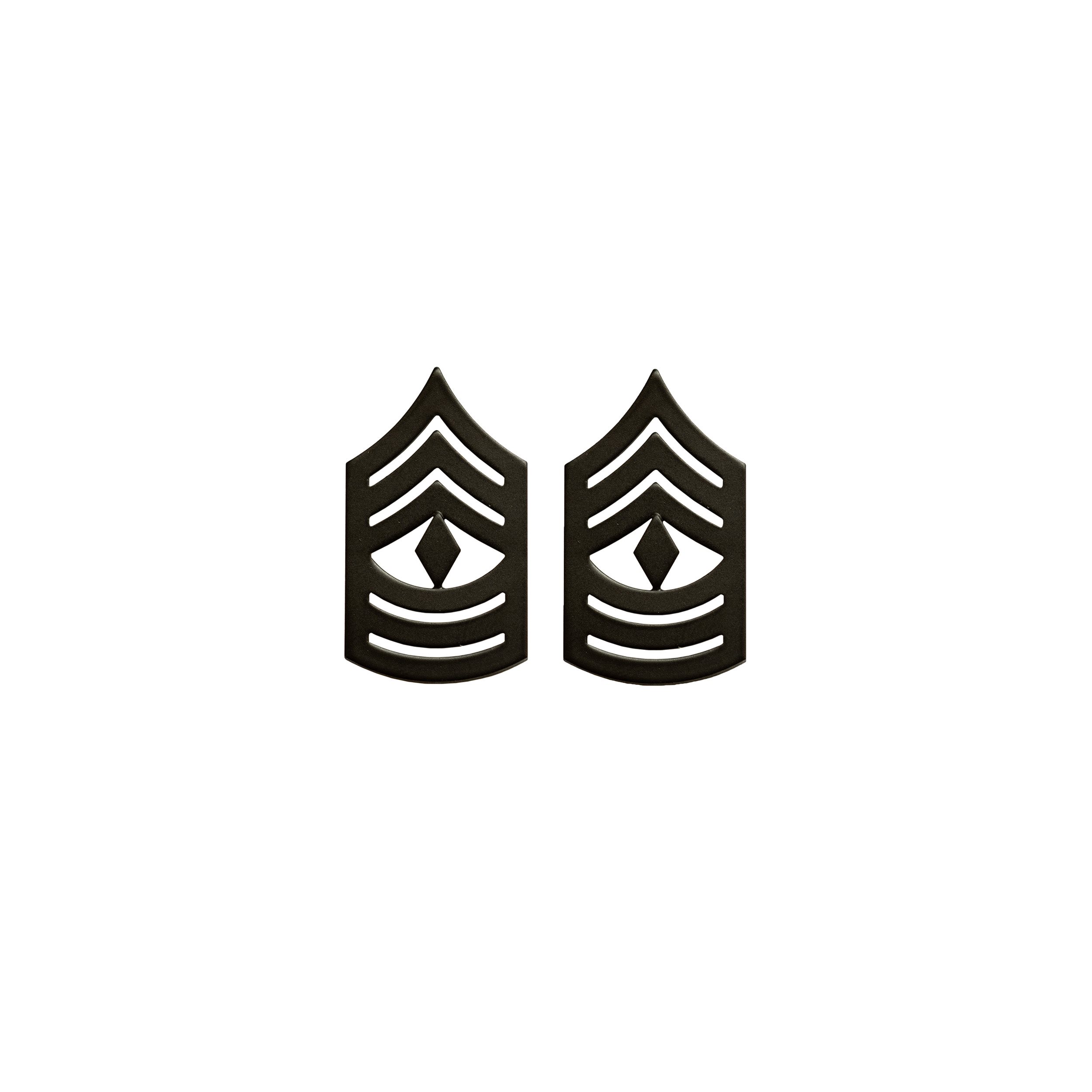 Coppia di distintivi di grado in metallo - Primo Sergente. Finitura nera opaca. Lavorazione accurata, prodotto negli Stati Uniti. Prezzo per coppia.