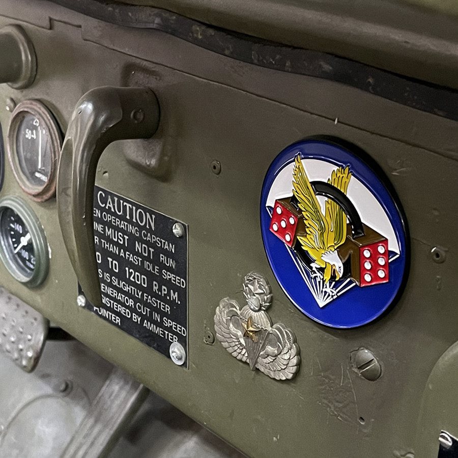 Logo del 506° Reggimento di Fanteria Paracadutisti degli Stati Uniti d'America del secondo dopoguerra. Realizzato con materiali di alta qualità, in acciaio da 3 mm. Include un kit per l'applicazione adesiva. Dimensioni: 7,8 cm x 7,8 cm.
