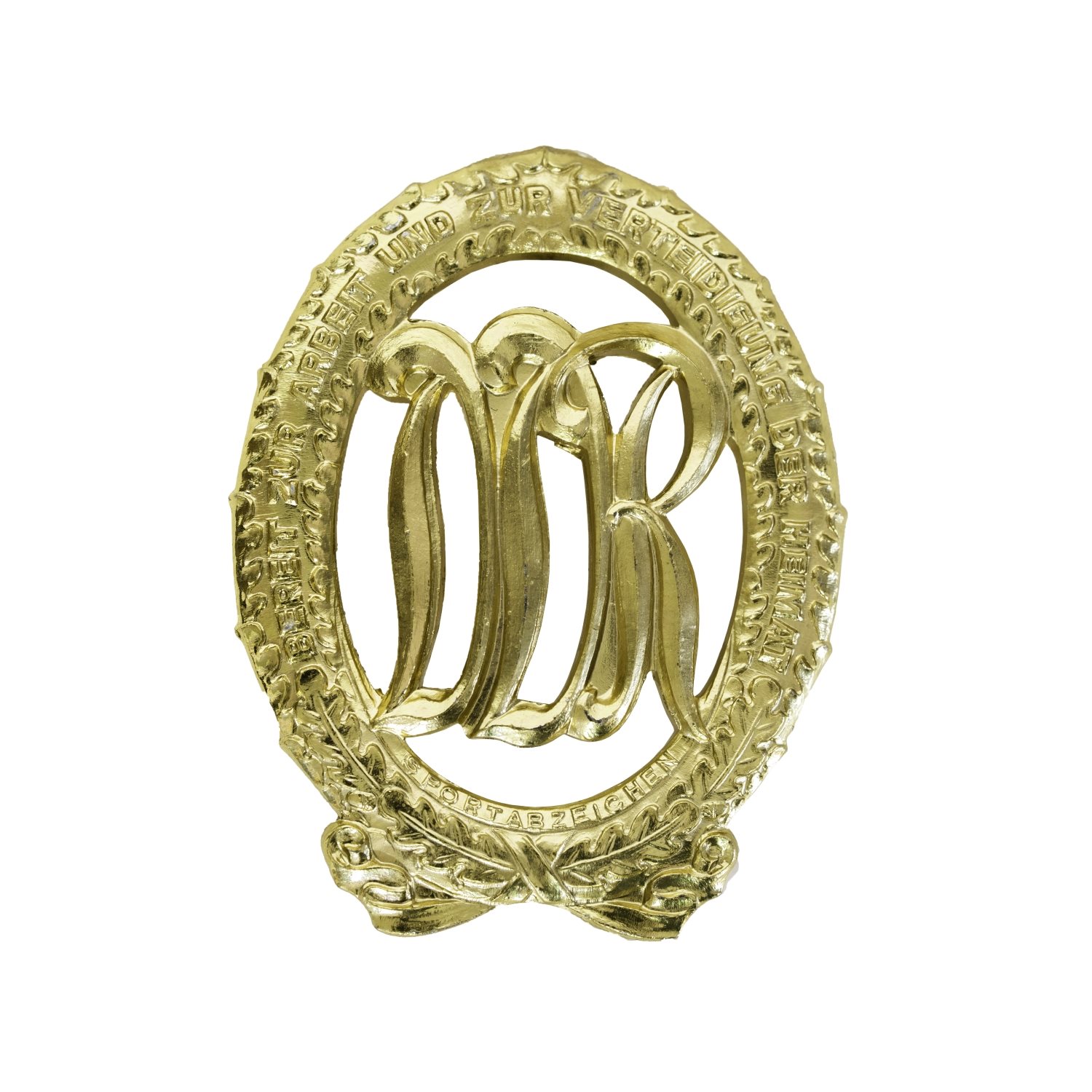 Distintivo originale dell'esercito della Germania dell'Est (NVA) in colore dorato con la scritta Bereit zur Arbeit und zur Verteidigung der Heimat = Pronti a lavorare e a difendere la patria. Nella parte inferiore la scritta Sportabzeichen = distintivo sportivo. Sul retro, in posizione verticale, è presente una spilla di chiusura.