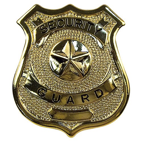 Distintivo metallico dorato con la scritta SECURITY GUARD.