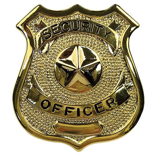 Distintivo metallico dorato con la scritta SECURITY OFFICER.