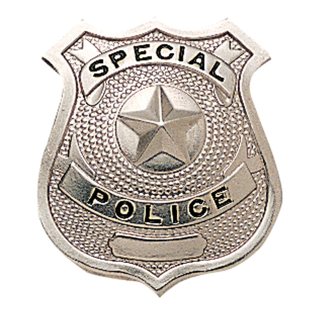 Distintivo della polizia "SPECIAL POLICE" in argento. Distintivo della polizia imitazione in metallo per scopi decorativi. Ulteriori informazioni