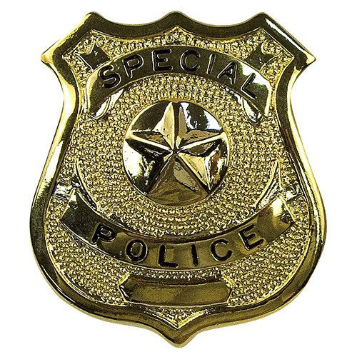 Distintivo della polizia "SPECIAL POLICE" in oro. Distintivo della polizia imitazione per scopi decorativi in metallo.