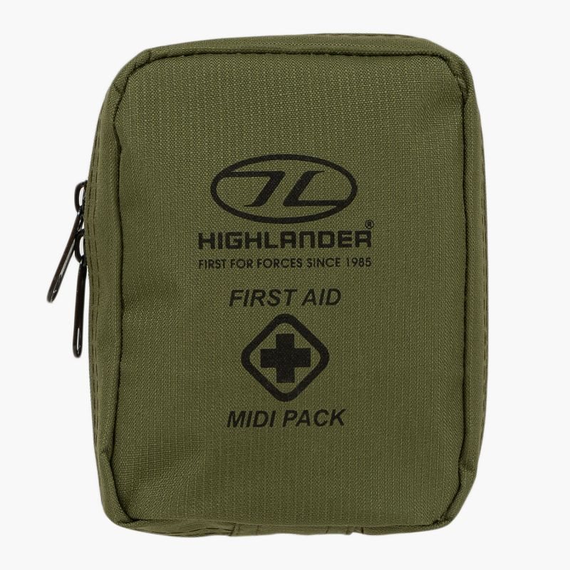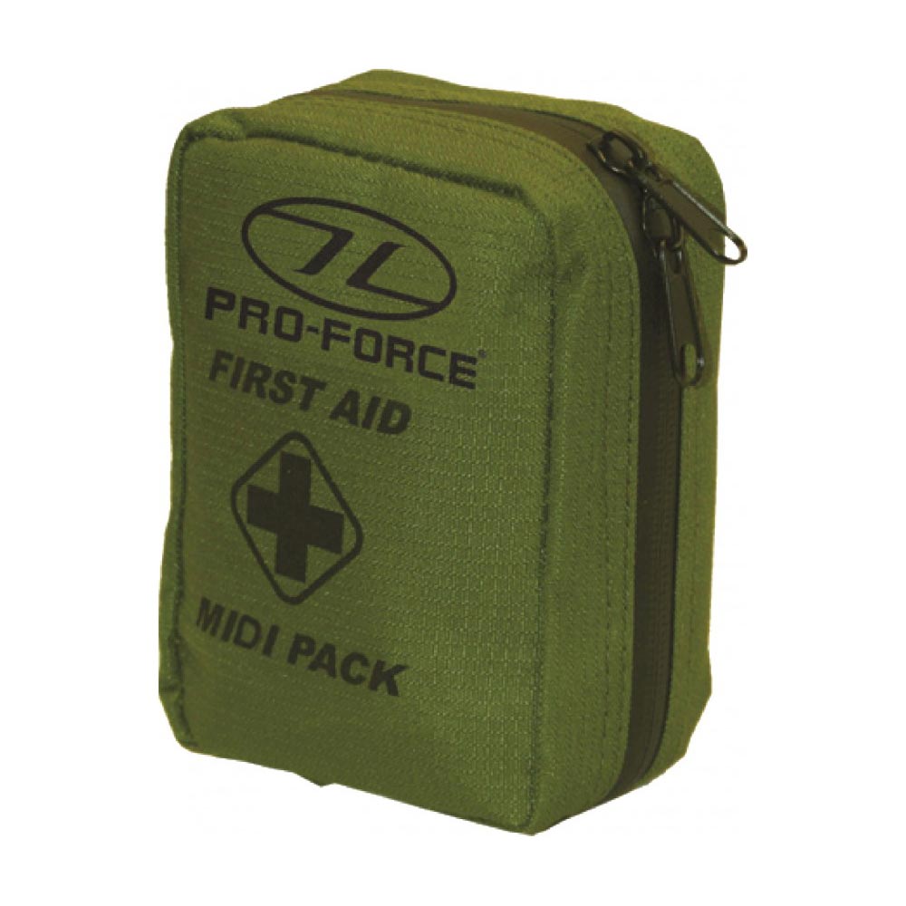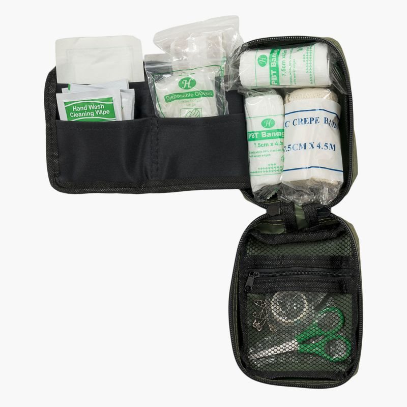 Kit di pronto soccorso di medie dimensioni contenuto in una custodia resistente. La custodia è realizzata in materiale rip-stop resistente e idrorepellente, il contenuto è accessibile tramite una cerniera metallica a doppio senso e resistente all'acqua. Sul retro della custodia è presente un passante per cintura con bottone metallico, assicurato da una chiusura in velcro in caso di malfunzionamento.